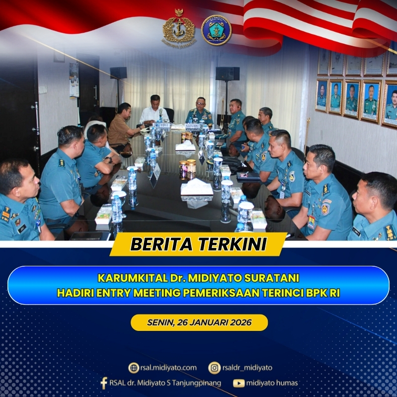 TNI Angkatan Laut. Karumkital dr. Midiyato Suratani Kolonel Laut (K) dr. Widya Wirawan, Sp.PD., M.H., FINASIM., menghadiri kegiatan Entry Meeting Pemeriksaan Terinci Badan Pemeriksa Keuangan Republik Indonesia (BPK RI) atas Laporan Keuangan Kementerian Pertahanan Tahun 2025 pada Unit Organisasi (UO) TNI Angkatan Laut di wilayah Koarmada I dan Rumkital dr. Midiyato Suratani. Kegiatan tersebut dilaksanakan […]
