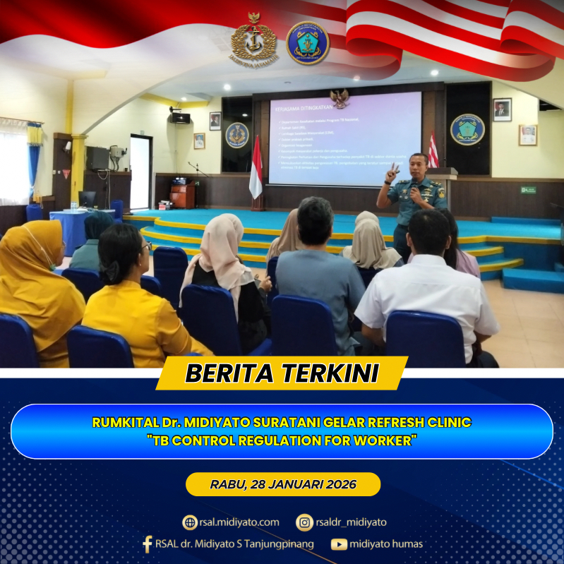 TNI Angkatan Laut. Rumkital dr. Midiyato Suratani melaksanakan Kegiatan Refresh Clinic dengan materi “TB Control Regulation For Worker”, bertempat di Gedung Serba Guna (GSG) Pulau Serasan Rumkital dr. Midiyato Suratani, Tanjungpinang, Provinsi Kepri. Rabu (28/01/2026) Kegiatan ini menghadirkan Kabag KUBT Mayor Laut (K) dr. Muhamad Ilfan, Sp.P., sebagai pemateri, yang menyampaikan materi terkait regulasi, strategi […]