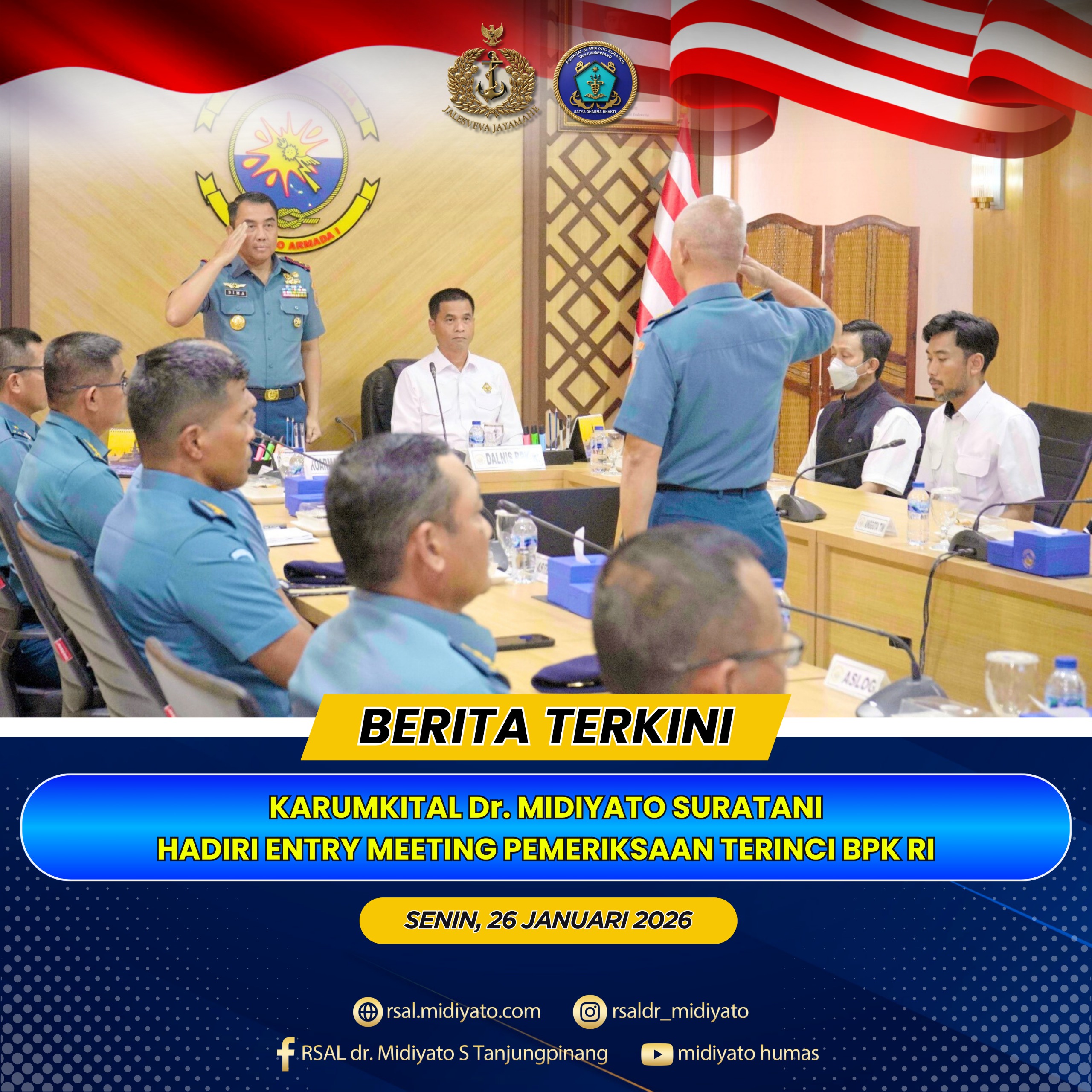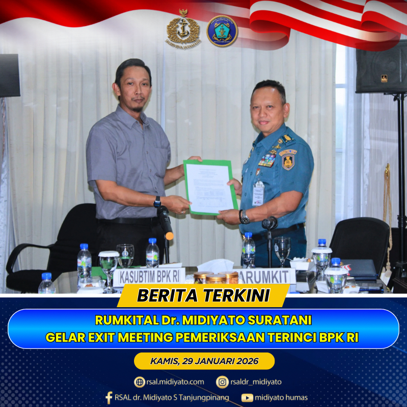 TNI Angkatan Laut. Rumkital dr. Midiyato Suratani melaksanakan kegiatan Exit Meeting Tim Badan Pemeriksa Keuangan Republik Indonesia (BPK RI) dalam rangka Pemeriksaan Terinci atas Laporan Keuangan Kementerian Pertahanan Tahun 2025 pada Unit Organisasi (UO) TNI Angkatan Laut di Rumkital dr. Midiyato Suratani. Kegiatan berlangsung di Ruang Rapat Karumkital dr. Midiyato Suratani, Tanjungpinang, Provinsi Kepri. Kamis […]
