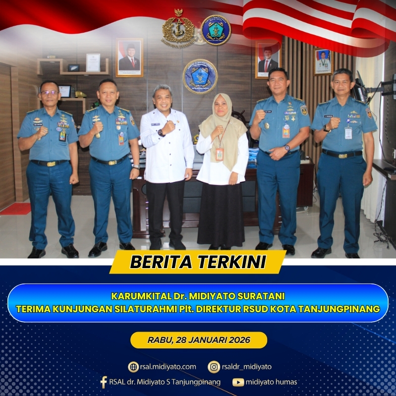 TNI Angkatan Laut. Karumkital dr. Midiyato Suratani Kolonel Laut (K) dr. Widya Wirawan, Sp.PD., M.H., FINASIM., menerima kunjungan silaturahmi Plt. Direktur RSUD Kota Tanjungpinang Deddy Arman, S.E., di Ruang Kerja Karumkital dr. Midiyato Suratani, Tanjungpinang, Provinsi Kepri. Rabu (28/01/2026) Kunjungan tersebut dilaksanakan dalam rangka berpamitan serta mohon diri, menyusul berakhirnya masa tugas Deddy Arman, S.E., […]