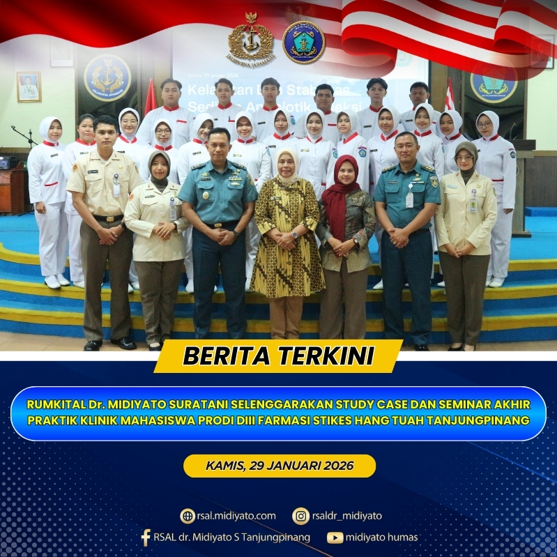 TNI Angkatan Laut. Rumkital dr. Midiyato Suratani menyelenggarakan kegiatan Study Case dan Seminar Akhir Praktik Klinik Mahasiswa STIKES Hang Tuah Tanjungpinang Program Studi DIII Farmasi Tingkat II dan Tingkat III, bertempat di Gedung Serba Guna (GSG) Pulau Serasan Rumkital dr. Midiyato Suratani, Tanjungpinang, Provinsi Kepri. Kamis (29/01/2026) Kegiatan ini merupakan bagian dari evaluasi akhir praktik […]