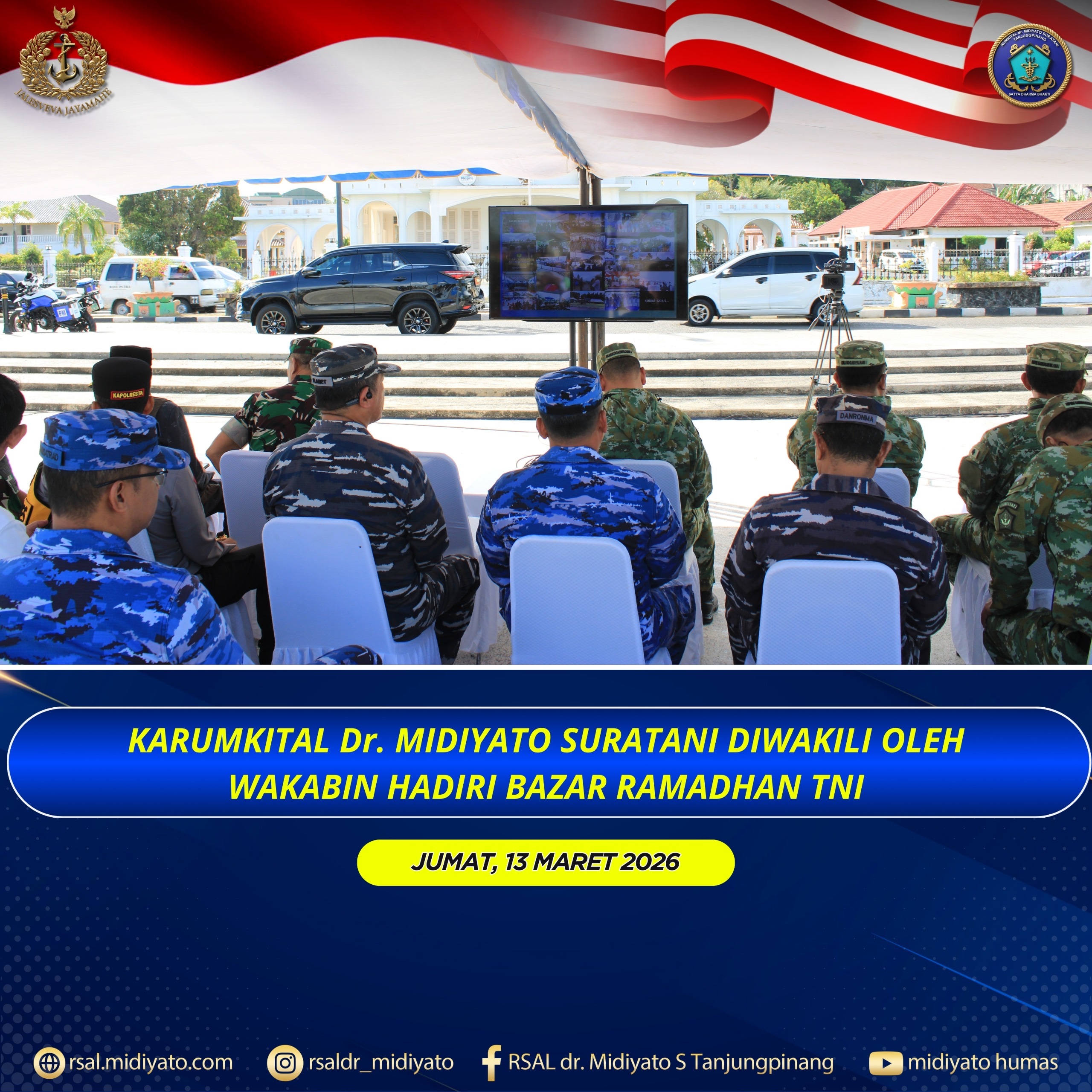 TNI Angkatan Laut. Karumkital dr. Midiyato Suratani Kolonel Laut (K) dr. Widya Wirawan, Sp.PD., M.H., FINASIM., diwakili oleh Wakabin Kolonel Laut (K) drg. Slamet Sutomo, Dipl.CE., Sp.Ort., menghadiri kegiatan Bazar Ramadhan TNI yang dilaksanakan secara serentak di seluruh wilayah Indonesia, dalam rangka menyambut Hari Raya Idul Fitri 1447 Hijriah. Kegiatan tersebut diselenggarakan oleh Kogabwilhan I […]
