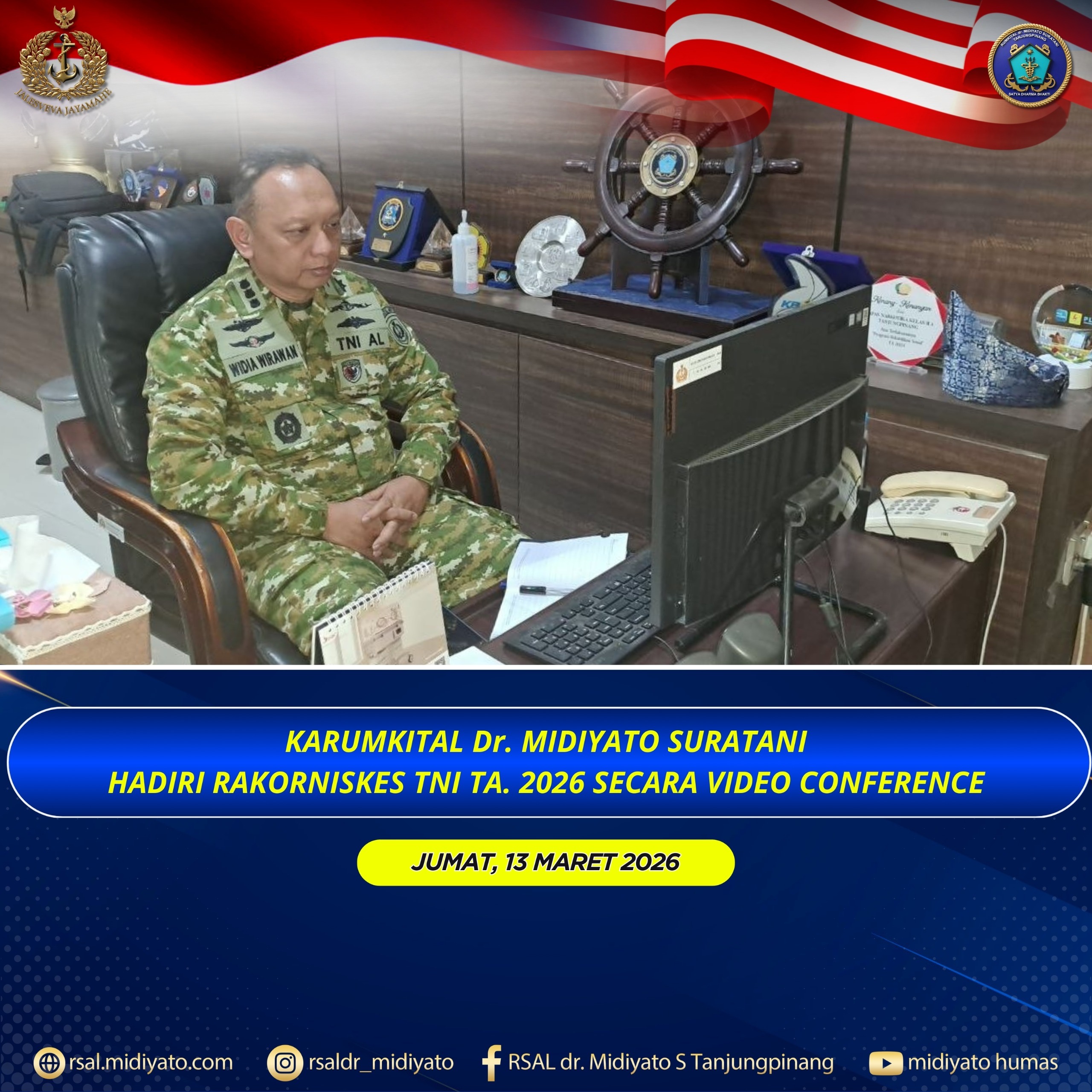 TNI Angkatan Laut. Karumkital dr. Midiyato Suratani Kolonel Laut (K) dr. Widya Wirawan, Sp.PD., M.H., FINASIM., menghadiri kegiatan Rapat Koordinasi Teknis Kesehatan (Rakorniskes) TNI TA. 2026 secara Video Conference (Vicon) dari Ruang Kerja Karumkital dr. Midiyato Suratani, Tanjungpinang, Provinsi Kepri, Jumat (13/03/2026). Kegiatan yang mengusung tema “Kesehatan TNI Siap Mewujudkan TNI Prima, Indonesia Maju dan […]