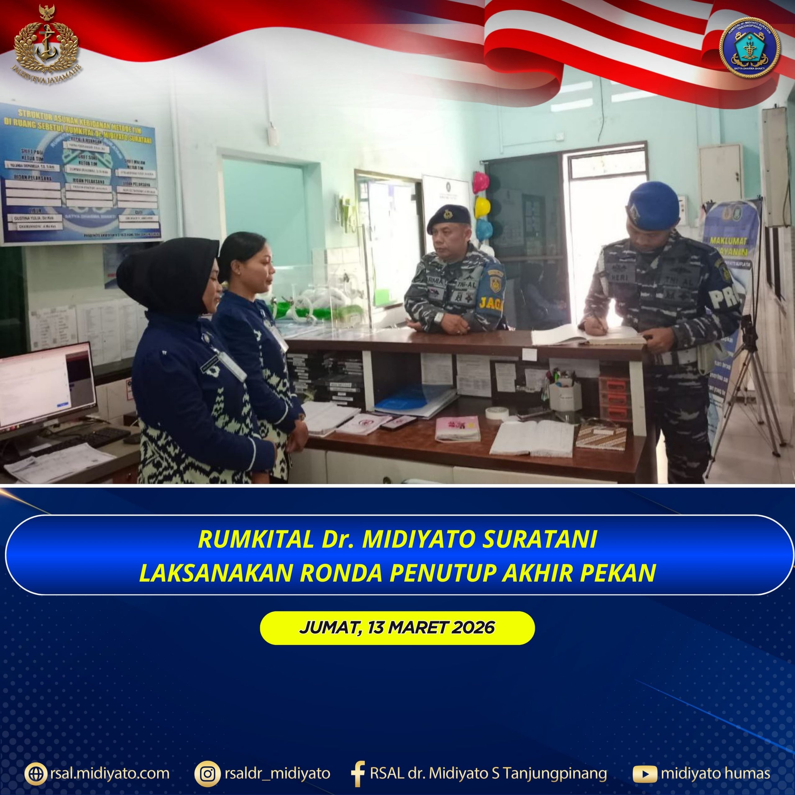TNI Angkatan Laut. Dalam rangka menjaga ketertiban, kebersihan, serta kesiapan fasilitas pelayanan kesehatan, Rumkital dr. Midiyato Suratani melaksanakan kegiatan rutin ronda penutup pada akhir pekan. Jumat (13/03/2026) Kegiatan ronda penutup dilaksanakan oleh tim yang bertugas dengan melakukan pemeriksaan menyeluruh terhadap kondisi lingkungan rumah sakit. Tidak hanya pengecekan material, pemeriksaan juga dilaksanakan di ruangan staf, serta […]