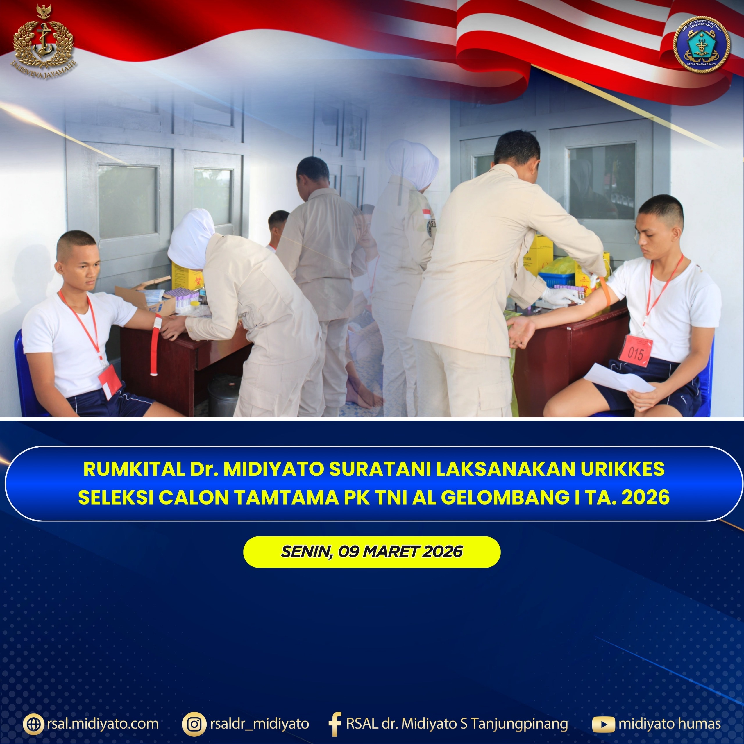 TNI Angkatan Laut. Rumkital dr. Midiyato Suratani melaksanakan kegiatan Uji Pemeriksaan Kesehatan (Urikkes) Seleksi Tingkat Pusat Penerimaan Calon Tamtama PK TNI AL Gelombang I TA. 2026 Satdik I Tanjung Uban. Kegiatan tersebut berlangsung di Gedung MCU Rumkital dr. Midiyato Suratani, Tanjungpinang, Provinsi Kepri. Senin (09/03/2026) Sebanyak 65 orang calon Tamtama PK TNI AL mengikuti rangkaian […]