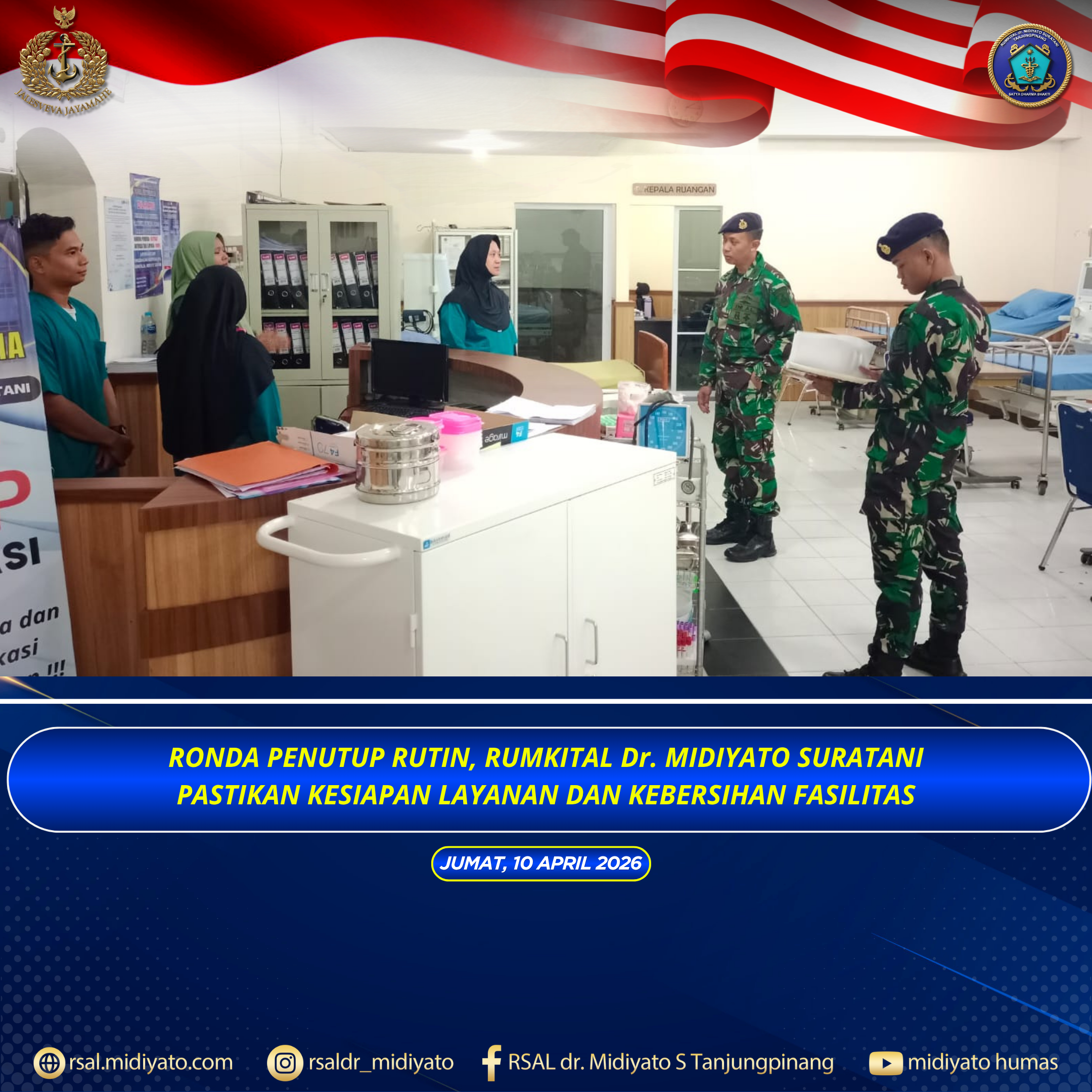 TNI Angkatan Laut. Rumkital dr. Midiyato Suratani melaksanakan kegiatan ronda penutup sebagai bagian dari rutinitas mingguan dalam menjaga kualitas pelayanan dan kesiapan fasilitas rumah sakit. Jumat (10/04/2026) Kegiatan ronda penutup pada hari ini dipimpin oleh Kadep Farmasi Kolonel Laut (K) Unsyura D. Budaya, S.Si., Apt., M.Farm., M.Tr.Opsla., serta diikuti oleh Pagatap, Bama, dan Baprov. Ronda […]