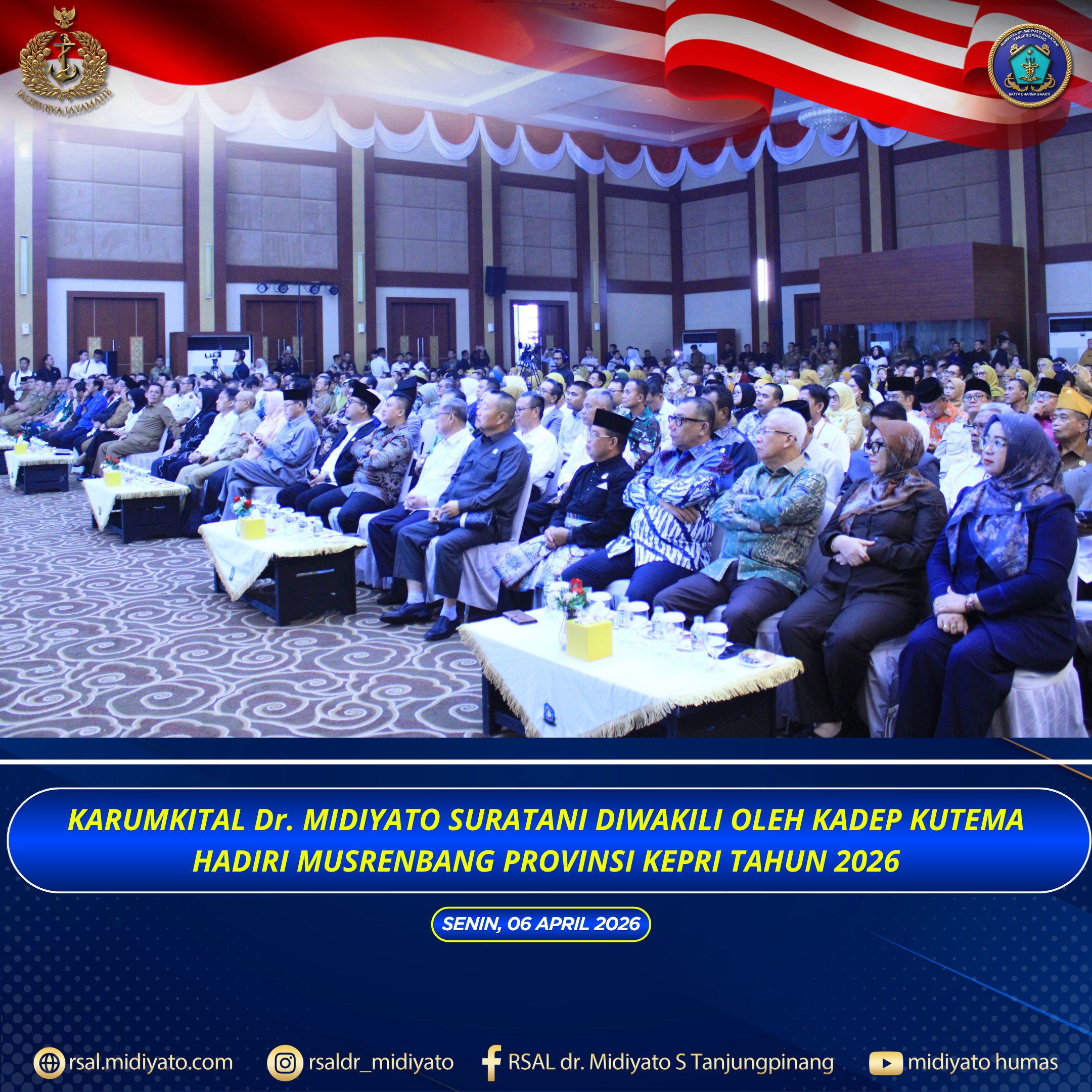 TNI Angkatan Laut. Karumkital dr. Midiyato Suratani Kolonel Laut (K) dr. Widya Wirawan, Sp.PD., M.H., FINASIM., yang diwakili oleh Kadep Kutema Letkol Laut (K) Suprijanto, S.Si., M.Kes., menghadiri kegiatan Musyawarah Perencanaan Pembangunan (Musrenbang) Provinsi Kepulauan Riau Tahun 2026 serta penyusunan RKPD Provinsi Kepulauan Riau Tahun 2027.Kegiatan tersebut berlangsung di bertempat di Balairung Wan Seri Beni […]