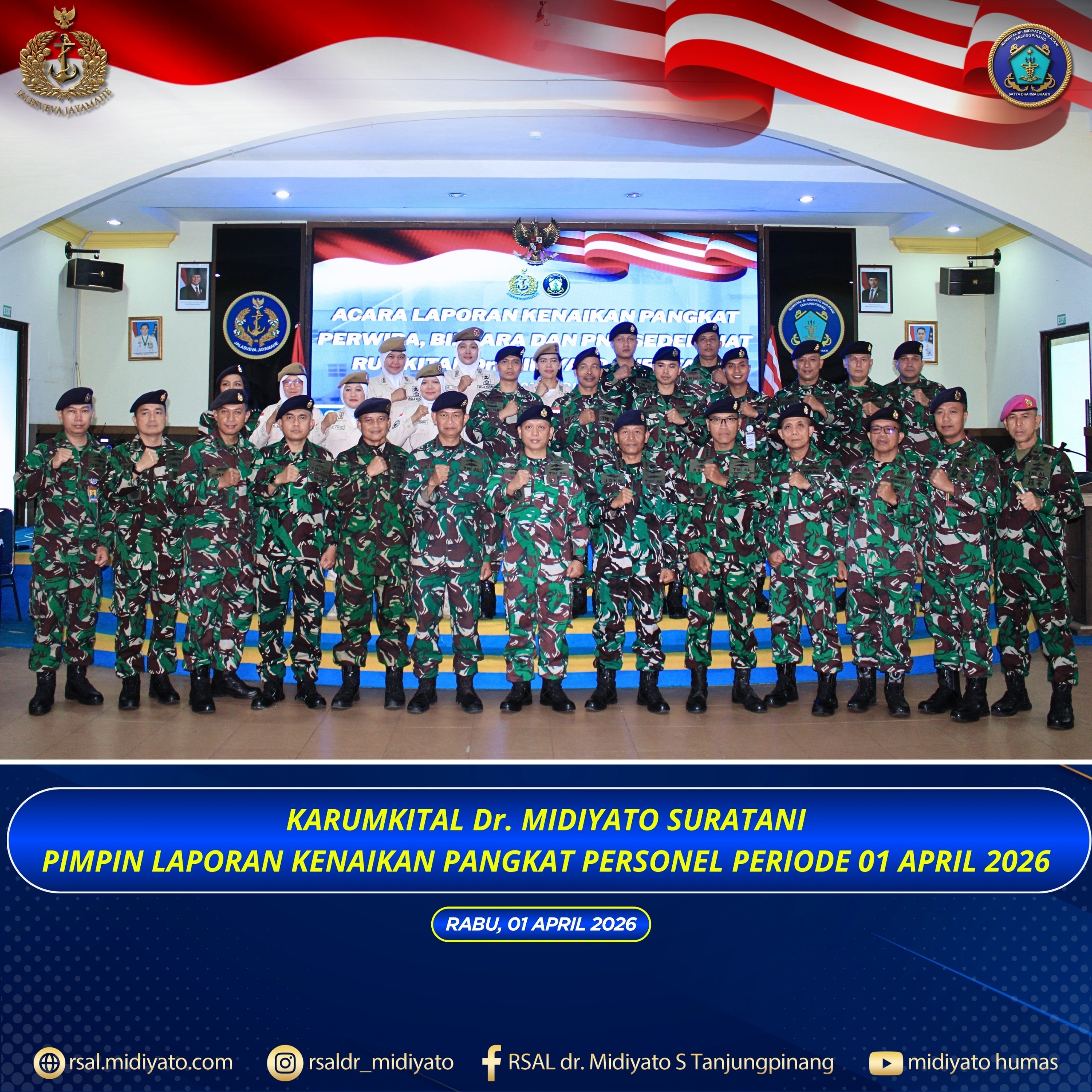 TNI Angkatan Laut. Karumkital dr. Midiyato Suratani Kolonel Laut (K) dr. Widya Wirawan, Sp.PD., M.H., FINASIM., memimpin acara Laporan Kenaikan Pangkat (Kenkat) personel Perwira, Bintara, dan PNS Rumkital dr. Midiyato Suratani periode 01 April 2026, yang dirangkaikan dengan acara ramah tamah Serah Terima Jabatan (Sertijab) Kadep Kutema dan Kenaikan Pangkat (Kenkat) personel Perwira, Bintara, dan […]