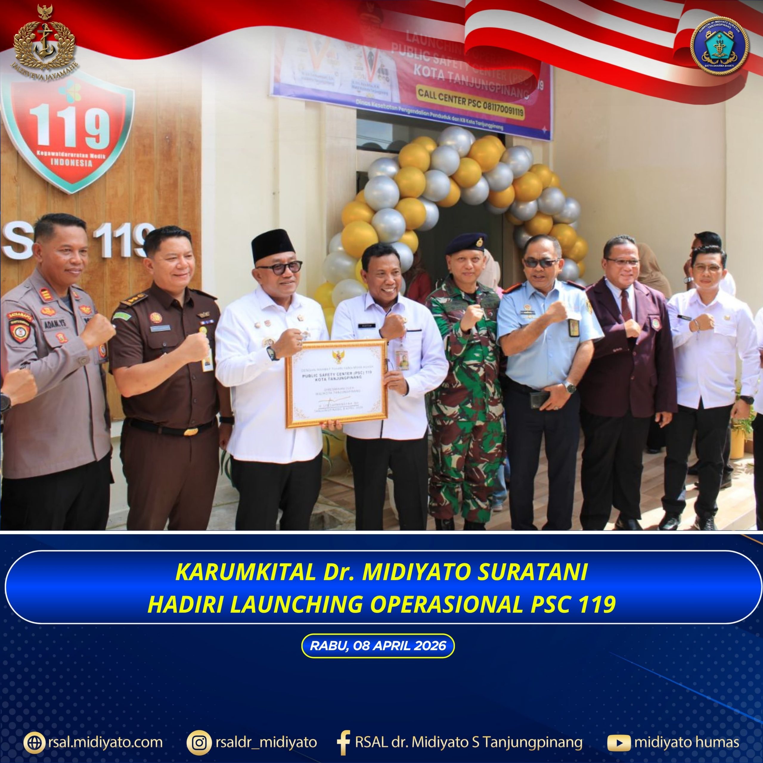 TNI Angkatan Laut. Karumkital dr. Midiyato Suratani Kolonel Laut (K) dr. Widya Wirawan, Sp.PD., M.H., FINASIM., menghadiri kegiatan Launching Operasional Public Safety Center (PSC) 119 Kota Tanjungpinang yang berlangsung di Gedung PSC 119, Jl. Ahmad Yani Km. 5, Kota Tanjungpinang, Provinsi Kepri. Rabu (08/04/2026) Kegiatan ini menjadi momentum penting dalam upaya meningkatkan kualitas pelayanan kesehatan, […]