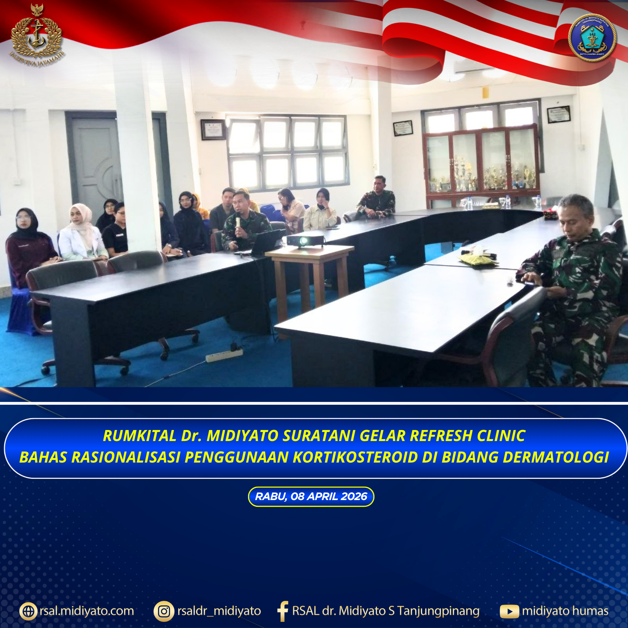 TNI Angkatan Laut. Rumkital dr. Midiyato Suratani menyelenggarakan kegiatan Refresh Clinic dengan mengangkat materi “Rasionalisasi Penggunaan Kortikosteroid di Bidang Dermatologi”, pada Rabu (08/04/2026). Kegiatan ini berlangsung di Gedung Cagar Budaya Rumkital dr. Midiyato Suratani, Tanjungpinang, Provinsi Kepri. Sebagai pemateri dalam kegiatan tersebut, Kasubbag Rik Umum Bag Urikkes, Mayor Laut (K) dr. Andre Yuindartanto, Sp.D.V.E., M.Ked.Klin., […]