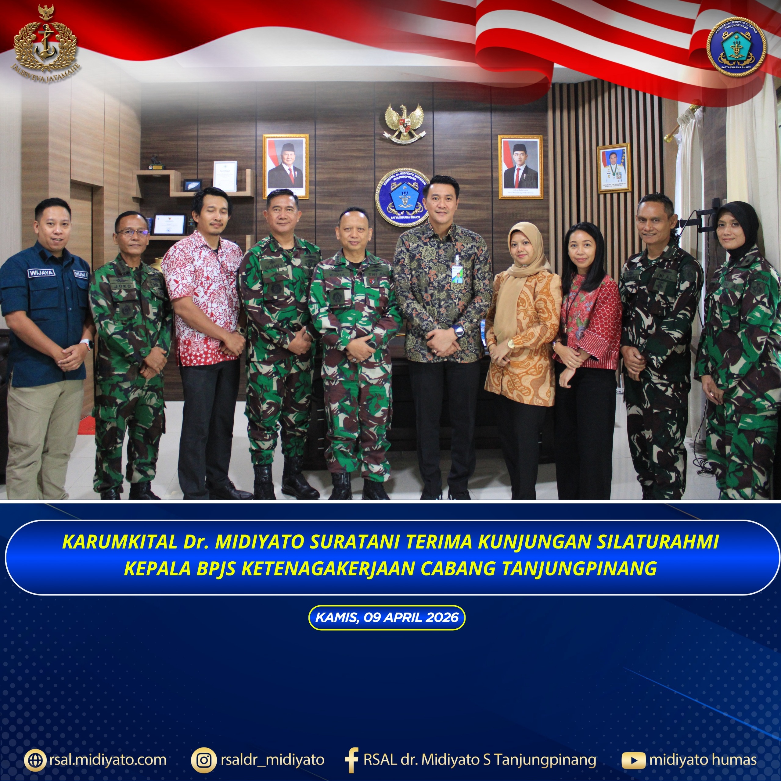 TNI Angkatan Laut. Karumkital dr. Midiyato Suratani Kolonel Laut (K) dr. Widya Wirawan, Sp.PD., M.H., FINASIM., menerima kunjungan silaturahmi Kepala BPJS Ketenagakerjaan Cabang Tanjungpinang, Iwan Kurniawan, beserta rombongan. Kegiatan tersebut berlangsung di Ruang Rapat Karumkital dr. Midiyato Suratani, Tanjungpinang, Provinsi Kepri. Kamis (09/04/2026) Mengawali kegiatan, Karumkital dr. Midiyato Suratani menyampaikan ucapan terima kasih dan apresiasi […]