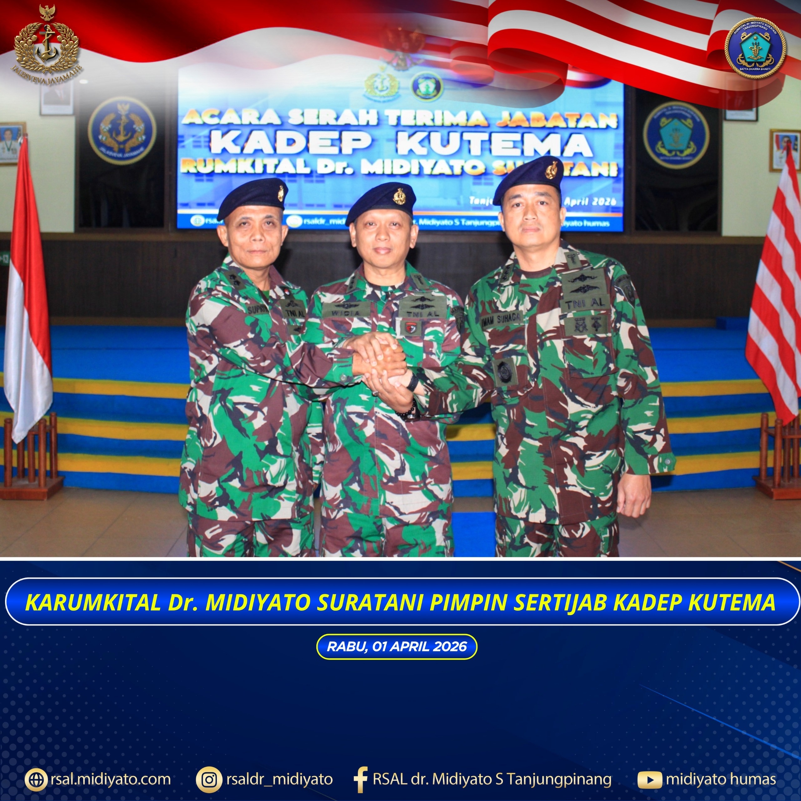 TNI Angkatan Laut. Karumkital dr. Midiyato Suratani Kolonel Laut (K) dr. Widya Wirawan, Sp.PD., M.H., FINASIM., memimpin acara Serah Terima Jabatan (Sertijab) Kadep Kutema (Kepala Departemen Penyakit Kulit, Kelamin, THT dan Mata) Rumkital dr. Midiyato Suratani, yang berlangsung di Gedung Serba Guna (GSG) Pulau Serasan Rumkital dr. Midiyato Suratani, Tanjungpinang, Provinsi Kepri. Rabu (01/04/2026) Dalam […]