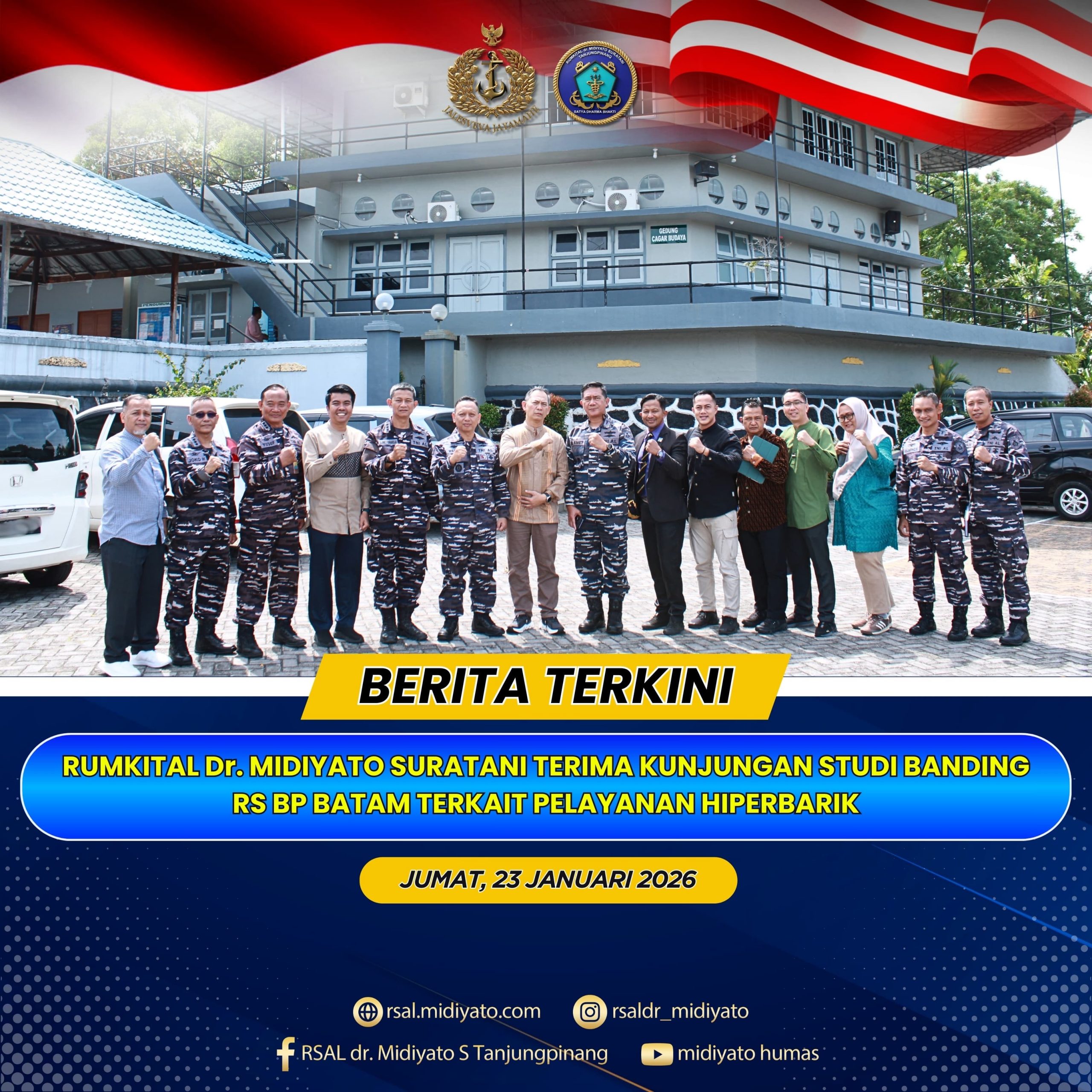 TNI Angkatan Laut. Rumkital dr. Midiyato Suratani menerima kunjungan Badan Usaha RS BP Batam dalam rangka Studi Banding tentang Persiapan Pelayanan Hiperbarik, bertempat di Gedung Cagar Budaya Rumkital dr. Midiyato Suratani, Tanjungpinang, Provinsi Kepri. Jumat (23/01/2026) Dalam sambutannya, Karumkital dr. Midiyato Suratani Kolonel Laut (K) dr. Widya Wirawan, Sp.PD., M.H., FINASIM., menyampaikan ucapan terima kasih […]