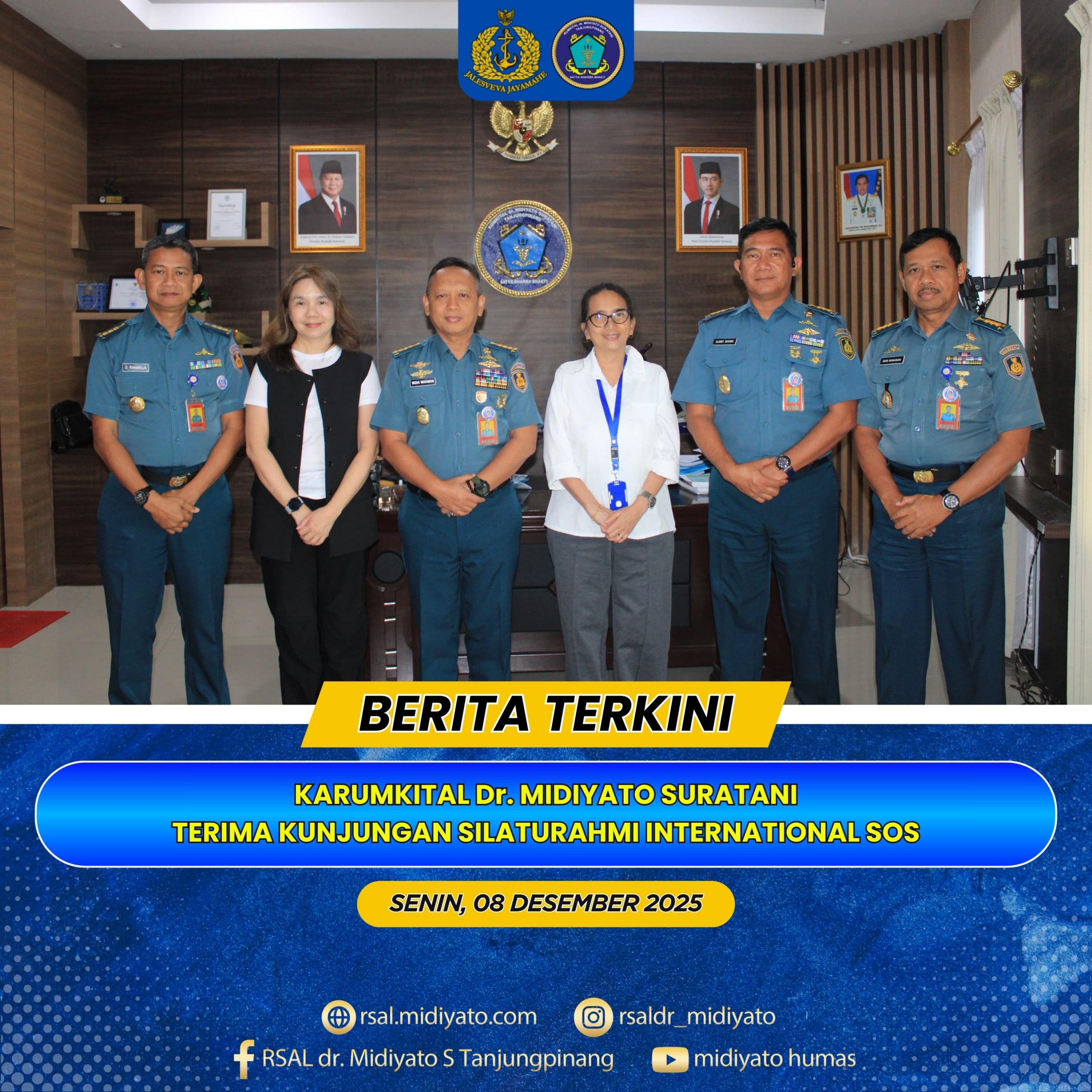 TNI Angkatan Laut. Karumkital Dr. Midiyato Suratani Kolonel Laut (K) dr. Widya Wirawan, Sp.PD., M.H., FINASIM., menerima kunjungan silaturahmi dari pihak International SOS bertempat di Ruang Rapat Karumkital Dr. Midiyato Suratani, Tanjungpinang, Provinsi Kepri, Senin (08/12/2025). Kunjungan ini dilaksanakan dalam rangka penjajakan kerja sama di bidang pelayanan kesehatan serta peningkatan jejaring rujukan dan pelayanan medis. […]