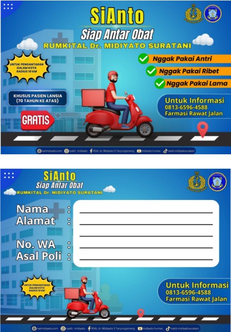 Dalam upaya meningkatkan kualitas layanan kesehatan, khususnya bagi pasien lanjut usia (lansia), Rumkital dr. Midiyato Suratani menghadirkan inovasi SiAnto (Siap antar obat) yang berjalan sejak tanggal 2 Februari 2024. Program ini bertujuan untuk mempermudah pasien, terutama lansia dan pasien dengan keterbatasan mobilitas, dalam mendapatkan obat tanpa harus kembali mengantre di apotek rumah sakit.