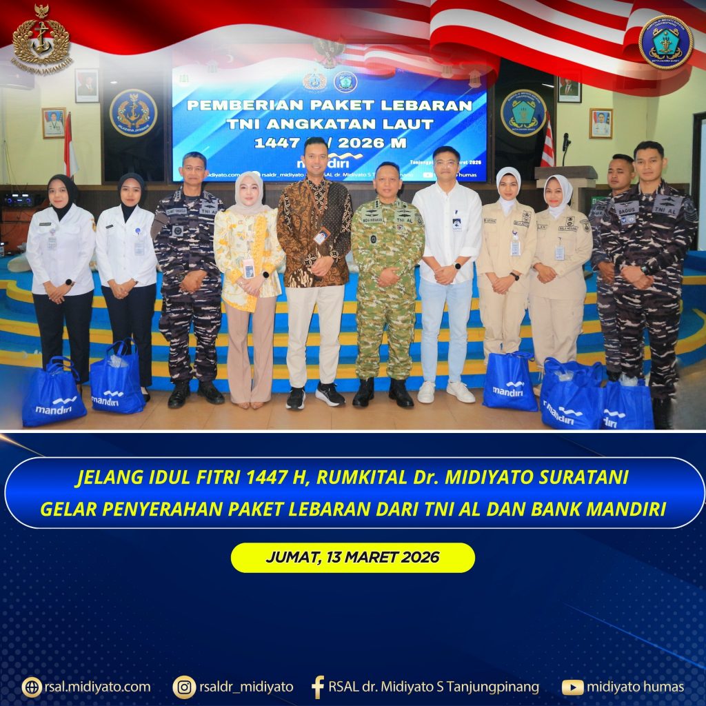 TNI Angkatan Laut. Rumkital dr. Midiyato Suratani menyelenggarakan kegiatan pemberian paket Lebaran dari TNI Angkatan Laut dan Bank Mandiri dalam rangka menyambut Hari Raya Idul Fitri 1447 H/2026 M. Kegiatan tersebut dilaksanakan di Gedung Serba Guna (GSG) Pulau Serasan Rumkital dr. Midiyato Suratani, Tanjungpinang, Provinsi Kepri. Jumat (13/03/2026)