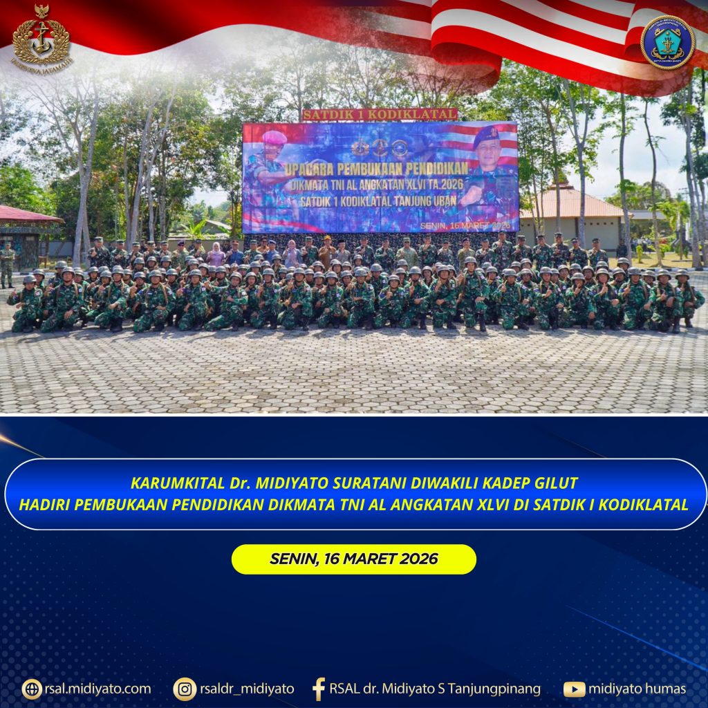 TNI Angkatan Laut. Karumkital dr. Midiyato Suratani Kolonel Laut (K) dr. Widya Wirawan, Sp.PD., M.H., FINASIM., yang diwakili oleh Kadep Gilut Kolonel Laut (K) drg. Suryanto Purba, Sp.Pros., menghadiri Upacara Pembukaan Pendidikan dan Orientasi Siswa Dikmata TNI AL Angkatan XLVI TA. 2026 Satdik I Kodiklatal Tanjung Uban. Kegiatan tersebut berlangsung di Lapangan Laut Arafuru Mako Satdik I Kodiklatal Tanjung Uban, Provinsi Kepri. Senin (16/03/2026)