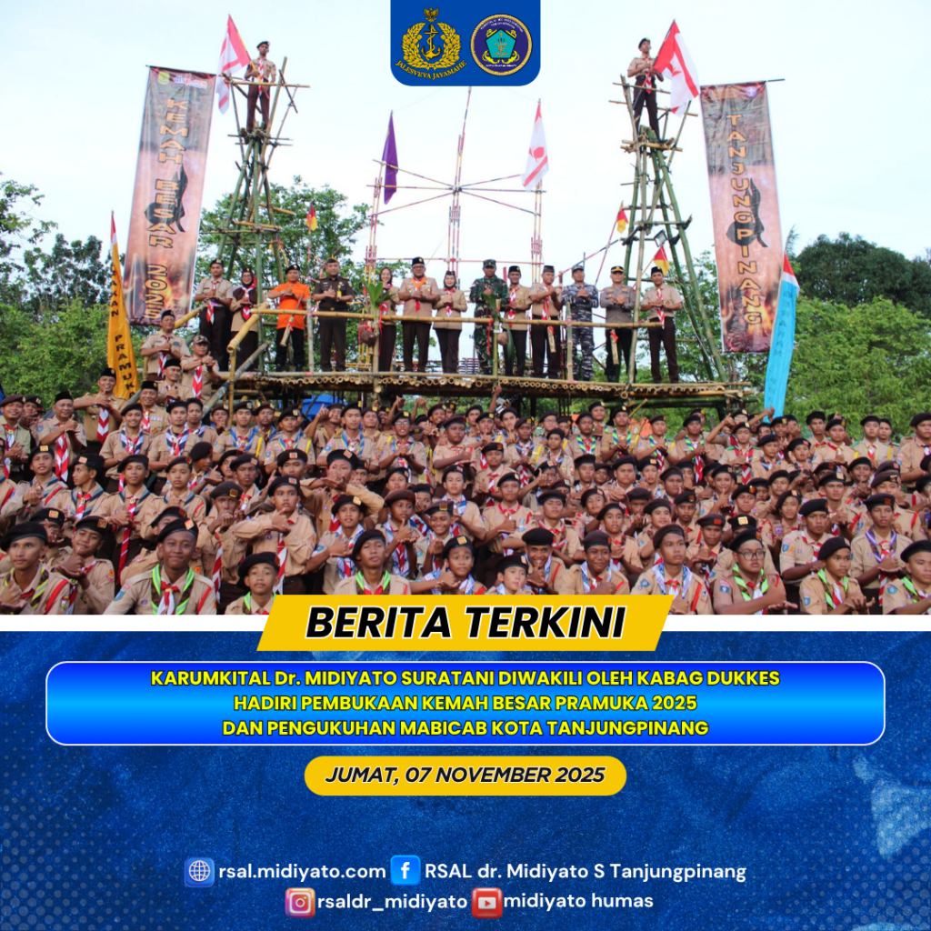 TNI Angkatan Laut. Kepala Rumah Sakit Angkatan Laut (Karumkital) Dr. Midiyato Suratani Kolonel Laut (K) dr. Widya Wirawan, Sp.PD., M.H., FINASIM., yang diwakili oleh Kabag Dukkes Letkol Laut (K) Edy Jarot Suryanto, A.Md., menghadiri Upacara Pembukaan Kemah Besar Pramuka Tahun 2025 yang disejalankan dengan Pengukuhan Anggota Majelis Pembimbing Cabang (Mabicab) Gerakan Pramuka Kota Tanjungpinang Masa Bakti 2025–2030. Kegiatan berlangsung di Bumi Perkemahan Bukit Manuk, Kampung Bugis, Kota Tanjungpinang, Provinsi Kepri. Jumat (07/11/2025)