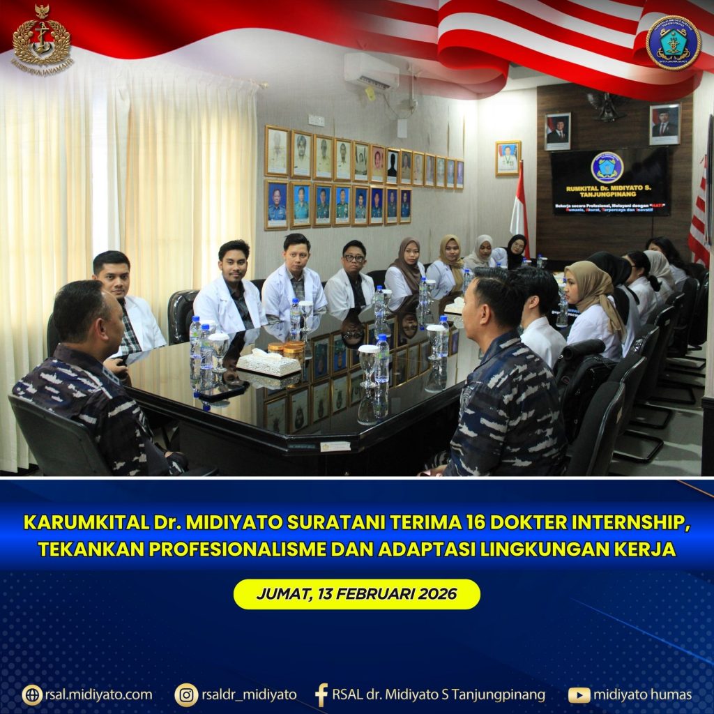 TNI Angkatan Laut. Karumkital dr. Midiyato Suratani Kolonel Laut (K) dr. Widya Wirawan, Sp.PD., M.H., FINASIM., secara resmi menerima 16 orang Dokter Internship yang akan melaksanakan praktik di Rumkital dr. Midiyato Suratani. Kegiatan berlangsung di Ruang Rapat Karumkital dr. Midiyato Suratani, Tanjungpinang, Provinsi Kepri. Jumat (13/02/2026)