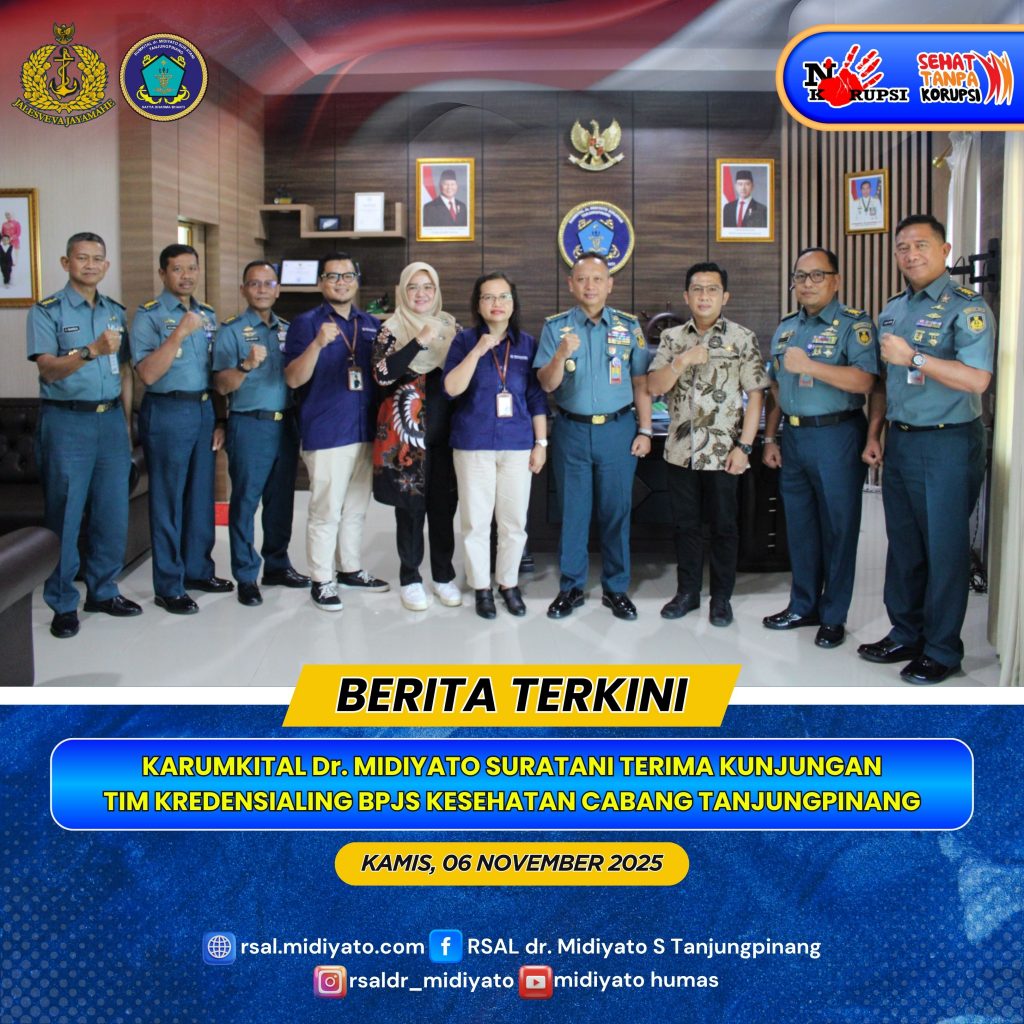 TNI Angkatan Laut. Kepala Rumah Sakit Angkatan Laut (Karumkital) Dr. Midiyato Suratani Kolonel Laut (K) dr. Widya Wirawan, Sp.PD., M.H., FINASIM., menerima kunjungan kerja dari Tim Kredensialing BPJS Kesehatan Cabang Tanjungpinang yang berlangsung di Ruang Rapat Karumkital Dr. Midiyato Suratani, Tanjungpinang, Provinsi Kepri. Kamis (06/11/2025)