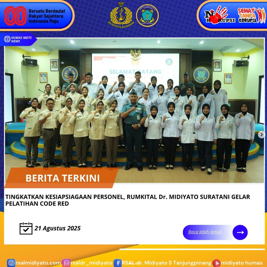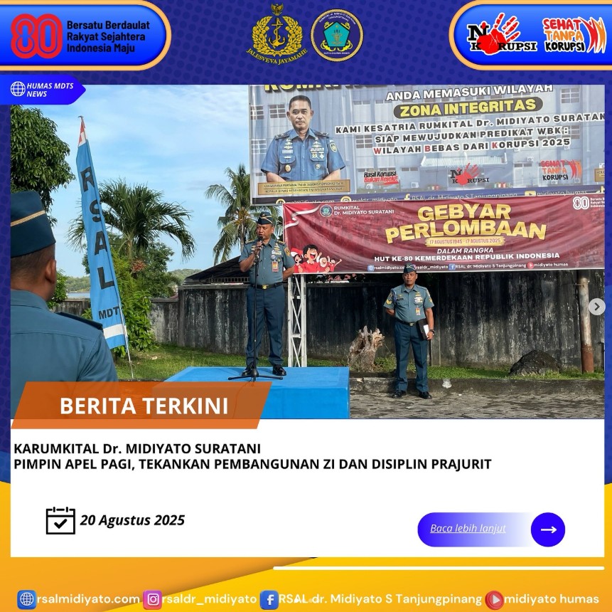 KARUMKITAL Dr. MIDIYATO SURATANI PIMPIN APEL PAGI, TEKANKAN PEMBANGUNAN ZI DAN DISIPLIN PRAJURIT TNI Angkatan Laut. Kepala Rumah Sakit Angkatan Laut (Karumkital) Dr. Midiyato Suratani Kolonel Laut (K) dr. Widya Wirawan, Sp.PD., M.H., FINASIM., memimpin apel pagi di Lapangan Apel Rumkital Dr. Midiyato Suratani, Tanjungpinang, Provinsi Kepri. Rabu (20/08/2025) Turut hadir dalam kegiatan, Wakabin Kolonel […]