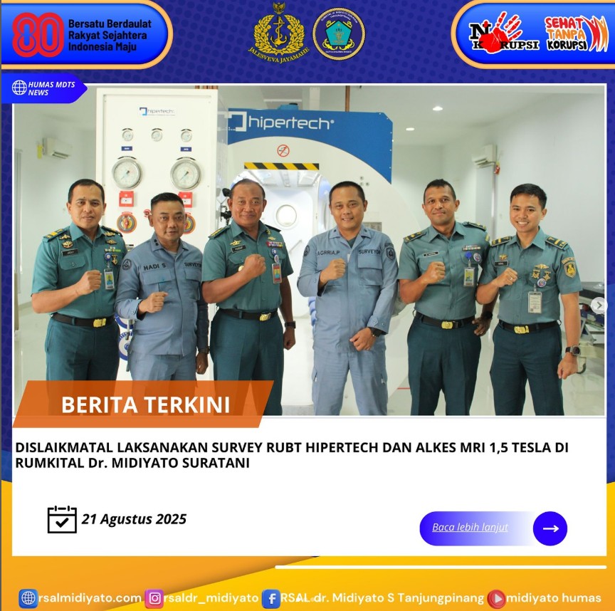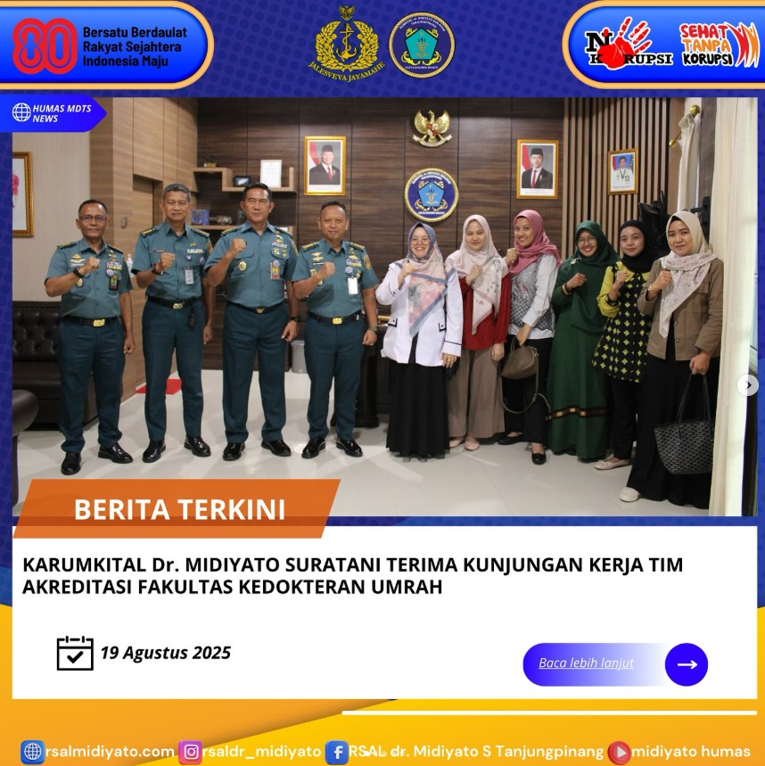 KARUMKITAL Dr. MIDIYATO SURATANI TERIMA KUNJUNGAN KERJA TIM AKREDITASI FAKULTAS KEDOKTERAN UMRAH TNI Angkatan Laut. Karumkital Dr. Midiyato Suratani Kolonel Laut (K) dr. Widya Wirawan, Sp.PD., M.H., FINASIM., menerima kunjungan kerja Tim Akreditasi Fakultas Kedokteran (FK) Universitas Maritim Raja Ali Haji (UMRAH). Pertemuan berlangsung di Ruang Rapat Karumkital Dr. Midiyato Suratani, Tanjungpinang, Provinsi Kepri. Selasa […]