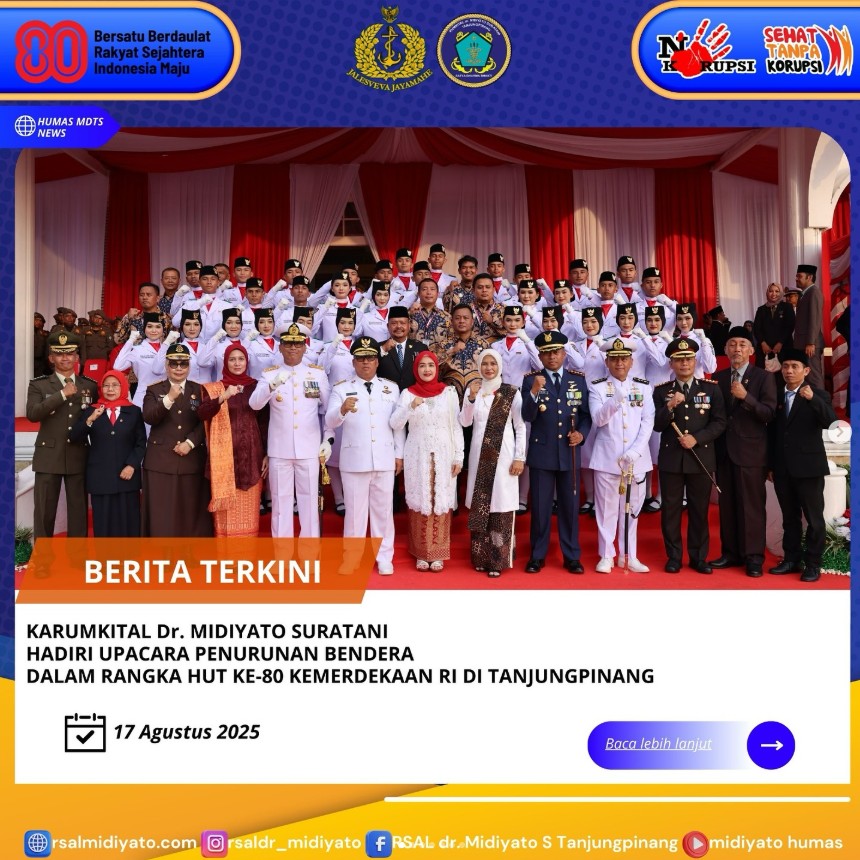 KARUMKITAL Dr. MIDIYATO SURATANI HADIRI UPACARA PENURUNAN BENDERA DALAM RANGKA HUT KE-80 KEMERDEKAAN RI DI TANJUNGPINANG TNI Angkatan Laut. Karumkital Dr. Midiyato Suratani Kolonel Laut (K) dr. Widya Wirawan, Sp.PD., M.H., FINASIM., menghadiri Upacara Penurunan Bendera dalam rangka memperingati Hari Ulang Tahun (HUT) ke-80 Kemerdekaan Republik Indonesia, yang digelar di Halaman Gedung Daerah, Jl. S. […]