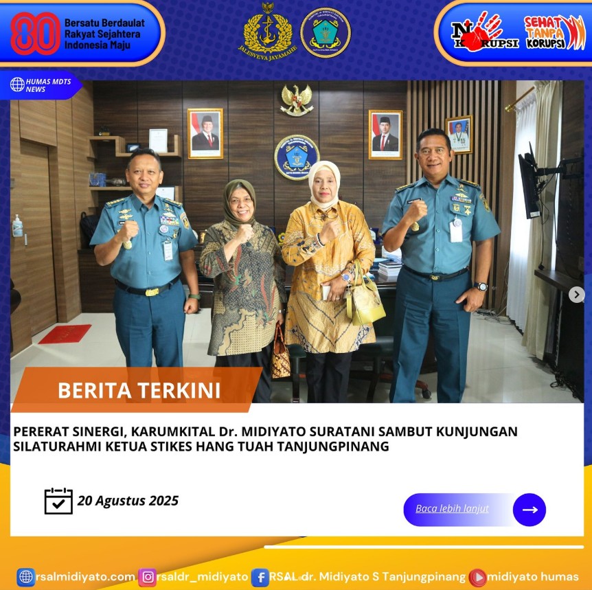 PERERAT SINERGI, KARUMKITAL Dr. MIDIYATO SURATANI SAMBUT KUNJUNGAN SILATURAHMI KETUA STIKES HANG TUAH TANJUNGPINANG TNI Angkatan Laut. Kepala Rumah Sakit Angkatan Laut (Karumkital) Dr. Midiyato Suratani Kolonel Laut (K) dr. Widya Wirawan, Sp.PD., M.H., FINASIM., menerima kunjungan silaturahmi dari Ketua Sekolah Tinggi Ilmu Kesehatan (STIKES) Hang Tuah Tanjungpinang, Kolonel Laut (Purn) Wiwiek Liestyaningrum, S.Kp., M.Kep., […]