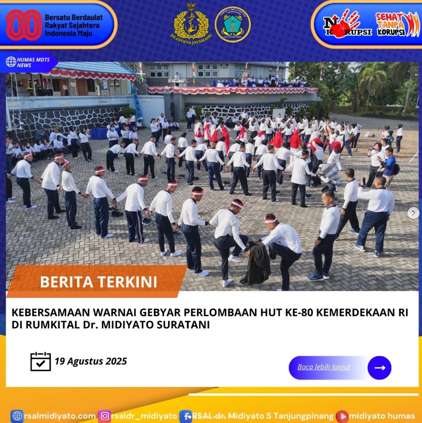 KEBERSAMAAN WARNAI GEBYAR PERLOMBAAN HUT KE-80 KEMERDEKAAN RI DI RUMKITAL Dr. MIDIYATO SURATANI TNI Angkatan Laut. Dalam rangka memperingati Hari Ulang Tahun (HUT) Ke-80 Kemerdekaan Republik Indonesia (RI), Karumkital Dr. Midiyato Suratani Kolonel Laut (K) dr. Widya Wirawan, Sp.PD., M.H., FINASIM., didampingi Ketua Ranting H Cabang 7 Gabungan Jalasenastri Mabesal Ny. Hilma W. Wirawan, memimpin […]