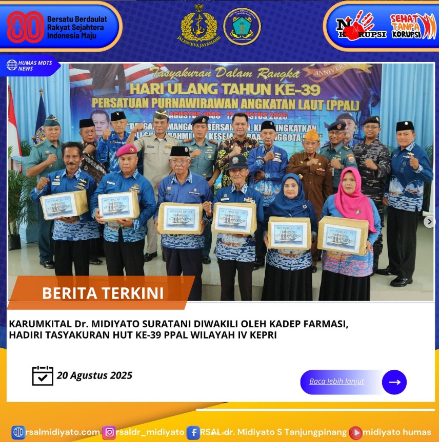 KARUMKITAL Dr. MIDIYATO SURATANI DIWAKILI OLEH KADEP FARMASI, HADIRI TASYAKURAN HUT KE-39 PPAL WILAYAH IV KEPRI TNI Angkatan Laut. Kepala Rumah Sakit Angkatan Laut (Karumkital) Dr. Midiyato Suratani Kolonel Laut (K) dr. Widya Wirawan, Sp.PD., M.H., FINASIM., yang diwakili oleh Kepala Departemen Farmasi (Kadepfar) Kolonel Laut (K) Barkah Siswoyo, S.Si., Apt., menghadiri undangan Persatuan Purnawirawan […]