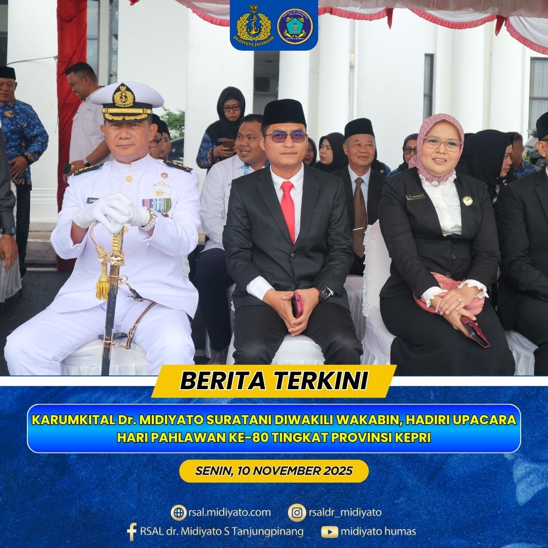 TNI Angkatan Laut. Kepala Rumah Sakit Angkatan Laut (Karumkital) Dr. Midiyato Suratani Kolonel Laut (K) dr. Widya Wirawan, Sp.PD., M.H., FINASIM., diwakili oleh Wakabin Kolonel Laut (K) drg. Slamet Sutomo, Dipl.CE., Sp.Ort., menghadiri upacara peringatan Hari Pahlawan ke-80 tingkat Provinsi Kepri yang digelar di Lapangan Apel Kantor Gubernur Kepri, Dompak, Kecamatan Bukit Bestari, Tanjungpinang, Senin […]