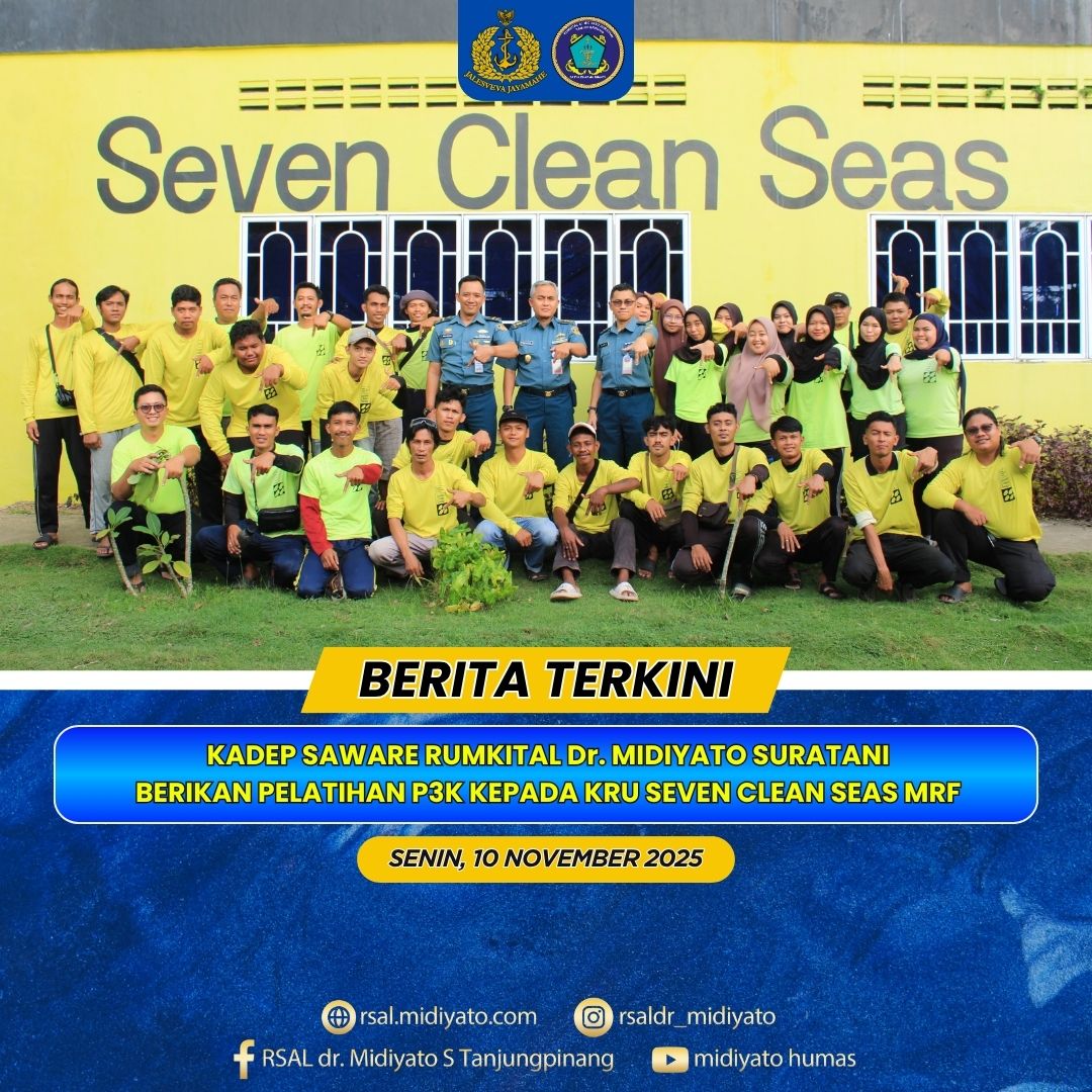 TNI Angkatan Laut. Kepala Departemen Saware Rumkital Dr. Midiyato Suratani Letkol Laut (K) dr. R. Eka Santoso, Sp.An., KIC., menjadi narasumber dalam Pelatihan Pertolongan Pertama Pada Kecelakaan (P3K) untuk kru Seven Clean Seas MRF (Materials Recovery Facility), di Jl. Wisata Bahari, Kawal, Kecamatan Gunung Kijang, Kabupaten Bintan, Provinsi Kepri. Senin (10/11/2025) Kegiatan ini dihadiri Kabag […]