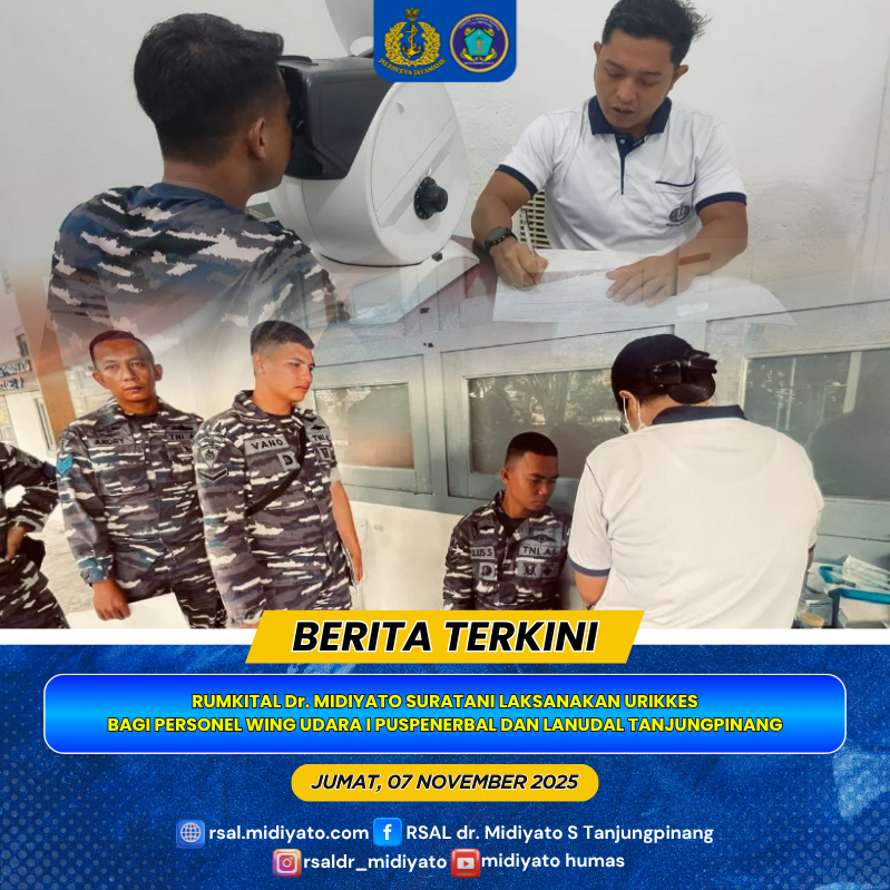 TNI Angkatan Laut. Rumah Sakit Angkatan Laut (Rumkital) Dr. Midiyato Suratani melaksanakan kegiatan Uji Pemeriksaan Kesehatan (Urikkes) untuk personel Wing Udara I Puspenerbal dan Lanudal Tanjungpinang. Kegiatan ini merupakan bagian dari syarat administrasi seleksi Satgas Rekonstruksi Gaza dan Urikkes Rutin TA 2025, bertempat di Gedung Medical Check Up (MCU) Dep. Kesla Rumkital Dr. Midiyato Suratani, […]