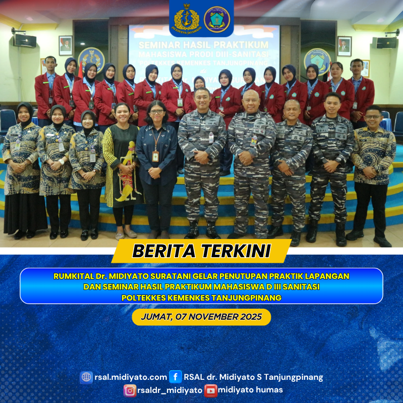 TNI Angkatan Laut. Rumah Sakit Angkatan Laut (Rumkital) Dr. Midiyato Suratani menggelar Acara Penutupan Praktik Lapangan dan Seminar Hasil Praktikum Mahasiswa Program Studi DIII Sanitasi Poltekkes Kemenkes Tanjungpinang Tahun 2025. Kegiatan berlangsung di Gedung Serba Guna (GSG) Pulau Serasan Rumkital Dr. Midiyato Suratani, Tanjungpinang, Provinsi Kepri. Jumat (07/11/2025) Hadir dalam kegiatan tersebut dari Rumkital Dr. […]