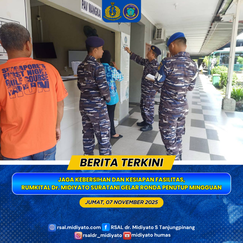 TNI Angkatan Laut. Rumah Sakit Angkatan Laut (Rumkital) Dr. Midiyato Suratani melaksanakan kegiatan ronda penutup sebagai bagian dari rutinitas mingguan pada Jumat (07/11/2025). Kegiatan ini dipimpin oleh Kadep Kutema Kolonel Laut (K) dr. Imam Suhada, Sp.S., dan diikuti oleh Pagatap, Bama, serta Baprov. Selama kegiatan berlangsung, tim melakukan pemeriksaan menyeluruh terhadap kebersihan dan kerapihan seluruh […]