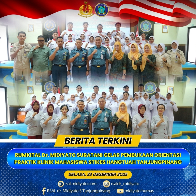 TNI Angkatan Laut. Rumkital Dr. Midiyato Suratani melaksanakan kegiatan Pembukaan Orientasi Praktik Klinik bagi Mahasiswa STIKES Hangtuah Tanjungpinang Program Studi Profesi Ners, DIII Keperawatan, dan DIII Farmasi. Kegiatan tersebut berlangsung di Gedung Serba Guna (GSG) Pulau Serasan Rumkital Dr. Midiyato Suratani, Tanjungpinang, Provinsi Kepri. Selasa (23/12/2025) Dalam sambutannya, Kabagwat Rumkital Dr. Midiyato Suratani Letkol Laut […]