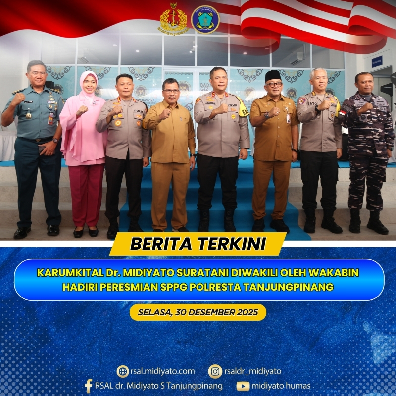 TNI Angkatan Laut. Karumkital dr. Midiyato Suratani Kolonel Laut (K) dr. Widya Wirawan, Sp.PD., M.H., FINASIM., diwakili oleh Wakabin Kolonel Laut (K) drg. Slamet Sutomo, Dipl.CE., Sp.Ort., menghadiri kegiatan Peresmian Satuan Pelayanan Pemenuhan Gizi (SPPG) Polresta Tanjungpinang yang diresmikan langsung oleh Kapolda Kepri Irjen Pol. Asep Safrudin, S.I.K., M.H., bertempat di SPPG Polresta Tanjungpinang, Jl. […]