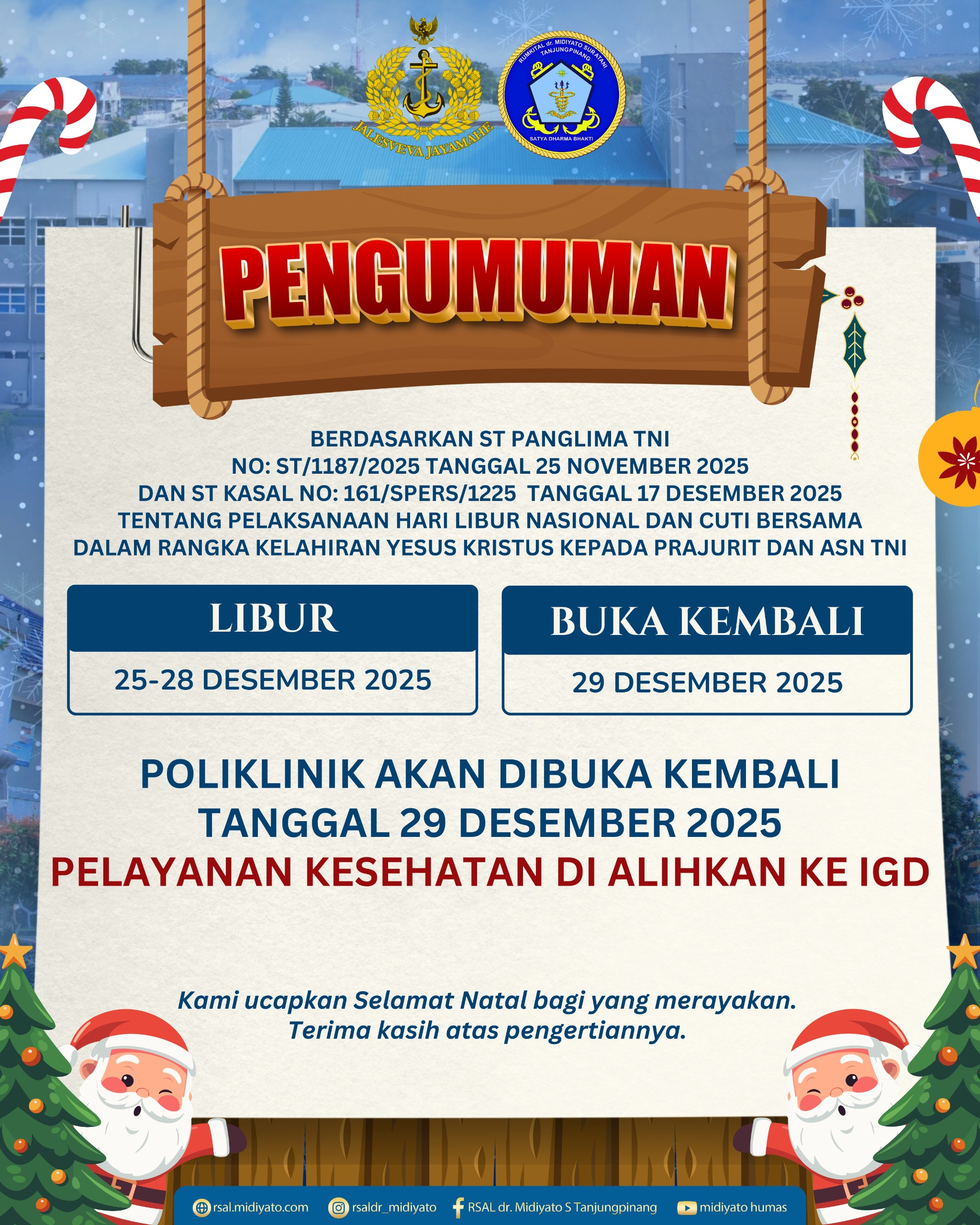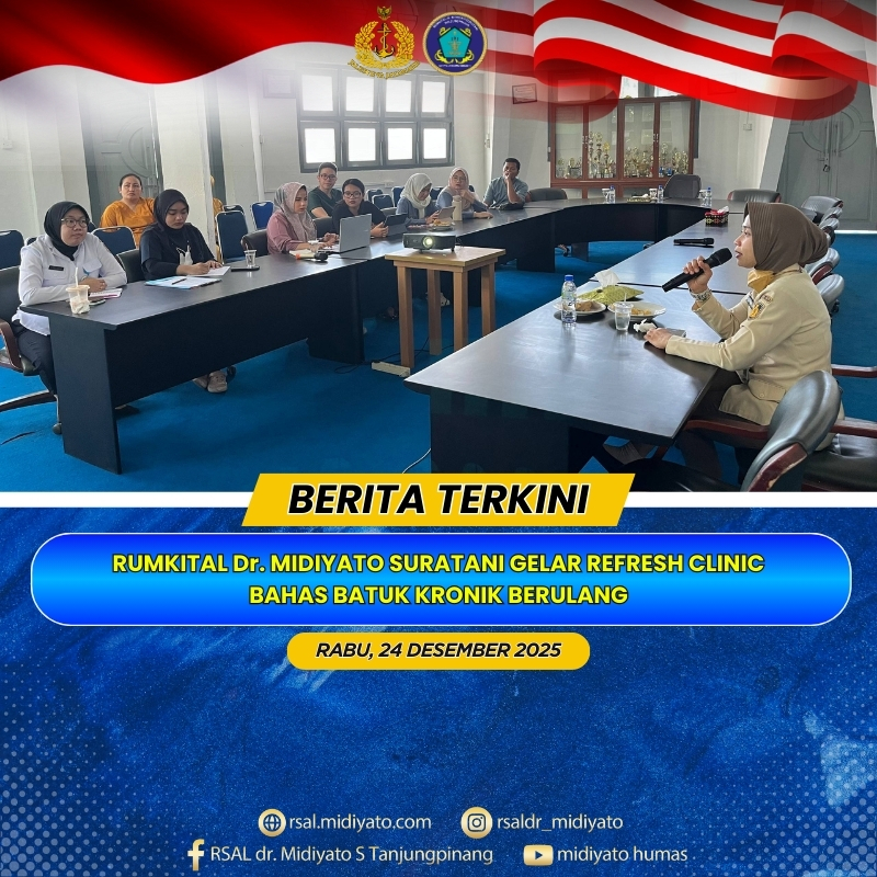 TNI Angkatan Laut. Rumkital dr. Midiyato Suratani melaksanakan kegiatan Refresh Clinic dengan materi “Batuk Kronik Berulang”, bertempat di Gedung Cagar Budaya Rumkital dr. Midiyato Suratani, Tanjungpinang, Provinsi Kepri. Rabu (24/12/2025) Kegiatan dibuka oleh Pembina IV/a dr. Dwi Lestari Avianti, Sp.A., M.Ked.Klin., selaku Kaur Poli Tumbuh Kembang Departemen KIA Rumkital dr. Midiyato Suratani. Paparan materi awal […]