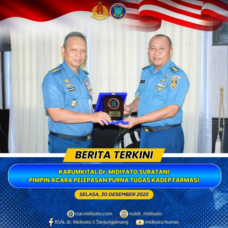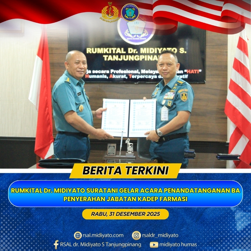 TNI Angkatan Laut. Rumkital dr. Midiyato Suratani menyelenggarakan kegiatan Penandatanganan Berita Acara (BA) Penyerahan Jabatan Kepala Departemen (Kadep) Farmasi, bertempat di Ruang Rapat Karumkital dr. Midiyato Suratani, Tanjungpinang, Provinsi Kepri. Rabu (31/12/2025) Kegiatan diawali dengan pembukaan dan sambutan oleh Karumkital dr. Midiyato Suratani Kolonel Laut (K) dr. Widya Wirawan, Sp.PD., M.H., FINASIM. Dalam sambutannya, Karumkital […]