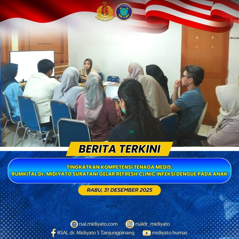 TNI Angkatan Laut. Rumkital dr. Midiyato Suratani menyelenggarakan kegiatan Refresh Clinic dengan materi “Tatalaksana Infeksi Dengue pada Anak”, bertempat di Ruang Komite Medik Rumkital dr. Midiyato Suratani, Tanjungpinang, Provinsi Kepri. Rabu (31/12/2025) Kegiatan ini menghadirkan Kaur Poli Tumbuh Kembang Departemen KIA, Pembina IV/a dr. Dwi Lestari Avianti, Sp.A., M.Ked.Klin., sebagai pemateri utama. Refresh Clinic bertujuan […]