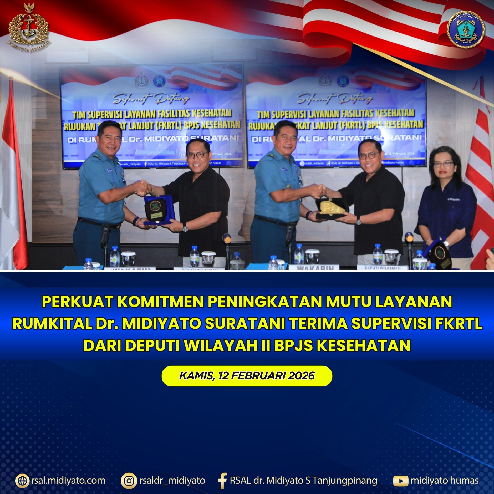 TNI Angkatan Laut. Rumkital dr. Midiyato Suratani menerima kunjungan dalam rangka Supervisi Layanan Fasilitas Kesehatan Rujukan Tingkat Lanjut (FKRTL) dari Deputi Wilayah II BPJS Kesehatan, bertempat di Ruang Rapat Karumkital dr. Midiyato Suratani, Tanjungpinang, Provinsi Kepri. Kamis (12/02/2026) Acara diawali dengan pembukaan oleh MC, dilanjutkan sambutan Karumkital dr. Midiyato Suratani Kolonel Laut (K) dr. Widya […]