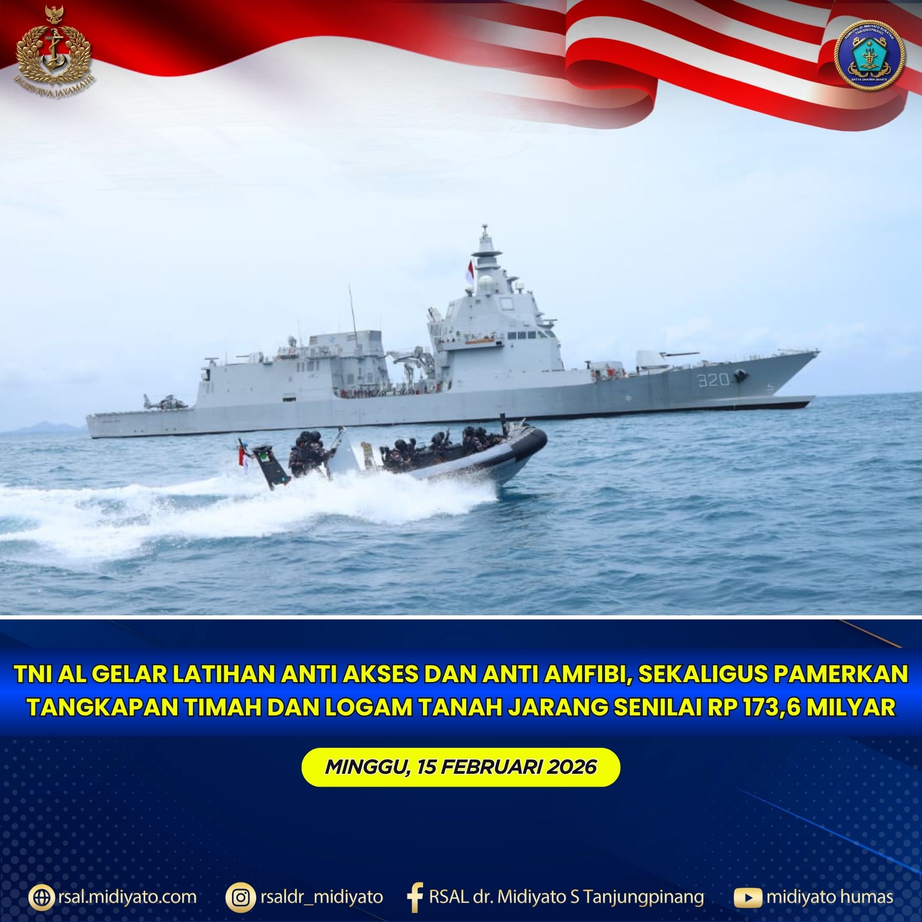 TNI Angkatan Laut. Rumkital dr. Midiyato Suratani melaksanakan Apel Khusus dalam rangka memperingati Hari Ulang Tahun (HUT) ke-80 Polisi Militer Angkatan Laut (Pomal) Tahun 2026, bertempat di Lapangan Apel Rumkital dr. Midiyato Suratani, Tanjungpinang, Provinsi Kepri. Jumat (20/02/2026) Pada kesempatan tersebut, amanat Kepala Staf Angkatan Laut (Kasal) Laksamana TNI Dr. Muhammad Ali, S.E., M.M., M.Tr.Opsla., […]