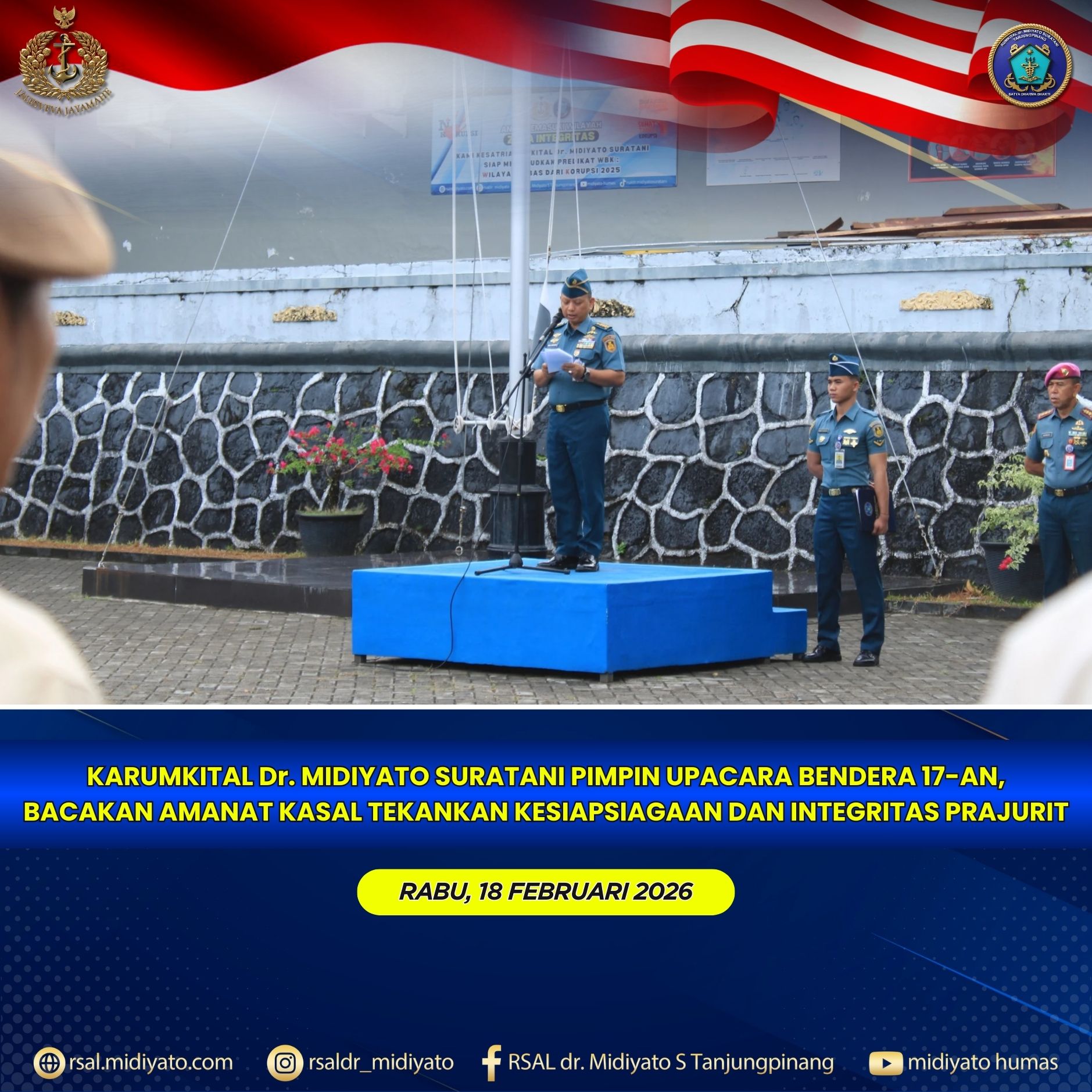 TNI Angkatan Laut. Karumkital dr. Midiyato Suratani Kolonel Laut (K) dr. Widya Wirawan, Sp.PD., M.H., FINASIM., memimpin pelaksanaan Upacara Bendera 17-an yang digelar di Lapangan Apel Rumkital dr. Midiyato Suratani, Tanjungpinang, Provinsi Kepri. Rabu (18/02/2026) Bertindak sebagai Komandan Upacara (Danup) Mayor Laut (K) dr. M. Sonny Yanuar Akbar, Sp.PA., serta Perwira Upacara (Paup) Lettu Laut […]