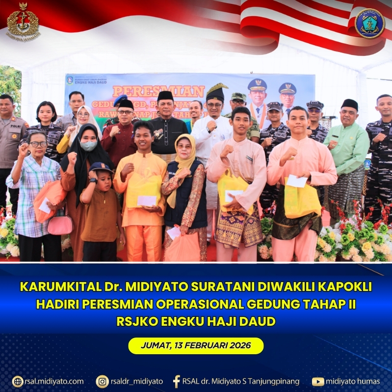 TNI Angkatan Laut. Karumkital dr. Midiyato Suratani Kolonel Laut (K) dr. Widya Wirawan, Sp.PD., M.H., FINASIM., yang diwakili Kapokli Kolonel Laut (K) Joko Haryono, S.E., menghadiri peresmian operasional pembangunan Gedung Tahap II Rumah Sakit Jiwa dan Ketergantungan Obat (RSJKO) Engku Haji Daud, bertempat di Gedung Penunjang RSJKO Engku Haji Daud, Teluk Lobam, Kabupaten Bintan, Provinsi […]