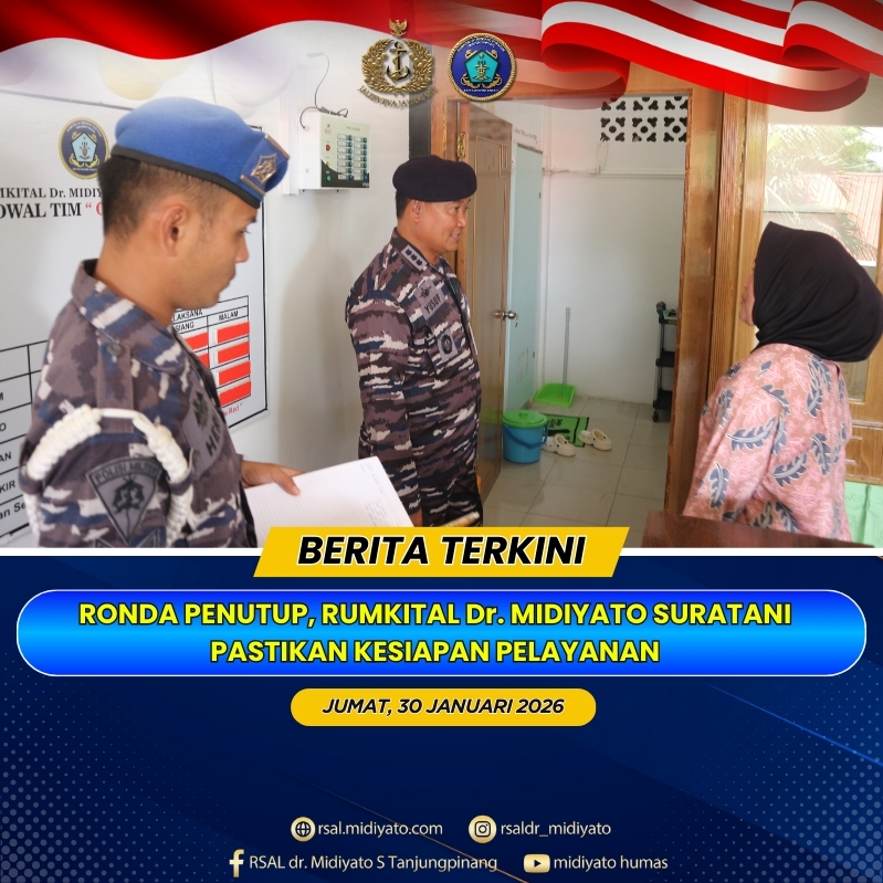 TNI Angkatan Laut. Dalam rangka meningkatkan kualitas dan keselamatan pelayanan rumah sakit, Rumkital dr. Midiyato Suratani melaksanakan kegiatan ronda penutup pada Jumat (30/01/2026). Kegiatan ini bertujuan untuk mengevaluasi kondisi lingkungan dan proses kerja, serta memastikan sarana dan prasarana pendukung pelayanan kesehatan dan keamanan dalam kondisi baik dan siap digunakan. Ronda penutup dipimpin oleh Kadep Kesla […]