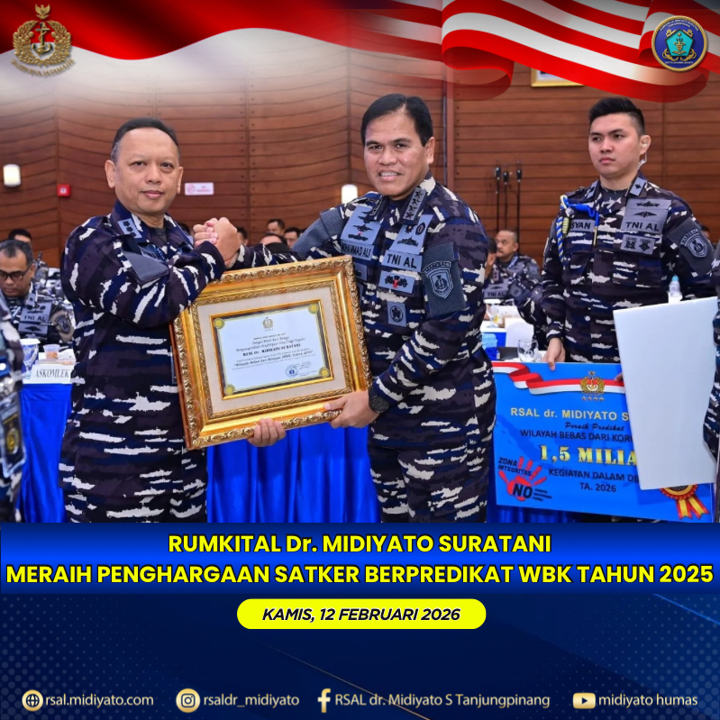 TNI Angkatan Laut. Rumkital dr. Midiyato Suratani menerima piagam dan penghargaan Satuan Kerja (Satker) berpredikat Wilayah Bebas dari Korupsi (WBK) Tahun 2025 dalam kegiatan Rapat Pimpinan (Rapim) TNI Angkatan Laut Tahun 2026. Kegiatan tersebut dipimpin langsung oleh Kepala Staf Angkatan Laut (Kasal) Laksamana TNI Dr. Muhammad Ali, S.E., M.M., M.Tr.Opsla., dan diselenggarakan di Auditorium Denma […]