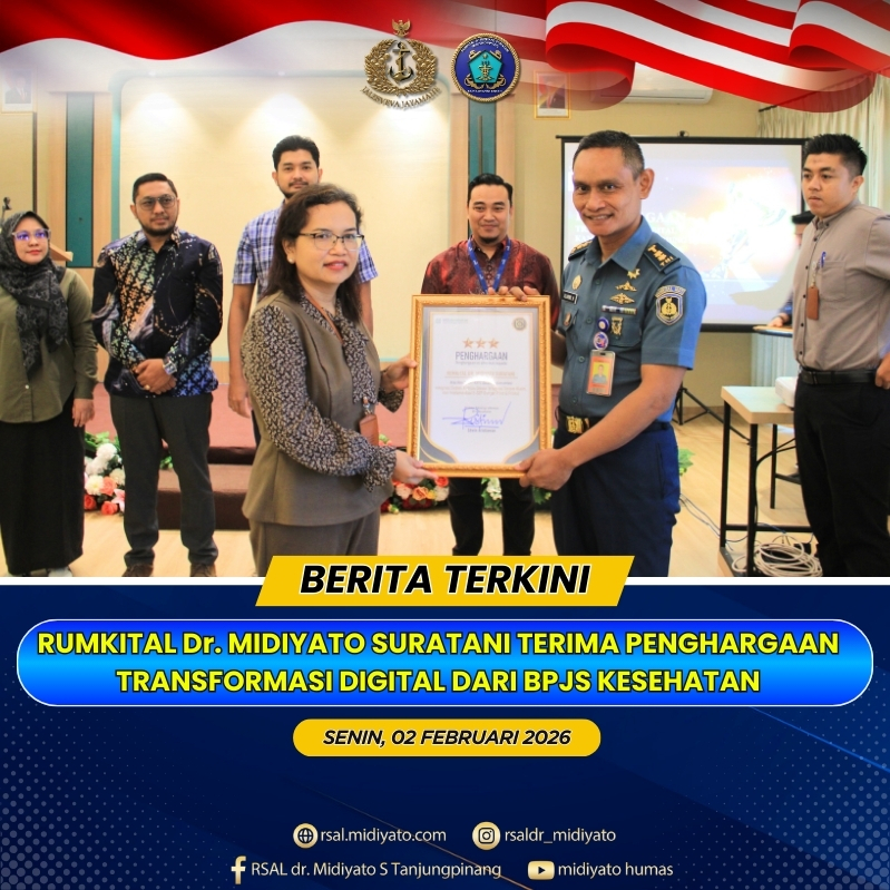 TNI Angkatan Laut. Rumkital dr. Midiyato Suratani menerima Penghargaan Transformasi Digital dari BPJS Kesehatan, dalam kegiatan Monitoring dan Evaluasi Area of Improvement SIBLING FKRTL serta Awarding Transformasi Digital. Kegiatan tersebut dilaksanakan di Alltrue Hotel Tanjungpinang, Provinsi Kepri. Senin (02/02/2026) Kegiatan diawali dengan pembukaan oleh MC, kemudian dilanjutkan dengan paparan oleh Kepala Bagian Mutu Layanan Fasilitas […]