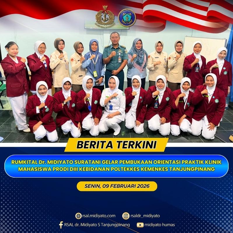 TNI Angkatan Laut. Rumkital dr. Midiyato Suratani menyelenggarakan Pembukaan Orientasi Praktik Klinik Mahasiswa Poltekkes Kemenkes Tanjungpinang Program Studi (Prodi) DIII Kebidanan Tingkat III, bertempat di Kelas Bangdiklat Rumkital dr. Midiyato Suratani, Tanjungpinang, Provinsi Kepri. Senin (09/02/2026) Kegiatan orientasi ini bertujuan untuk memberikan pembekalan awal kepada mahasiswa sebelum melaksanakan praktik klinik di Rumkital dr. Midiyato Suratani, […]