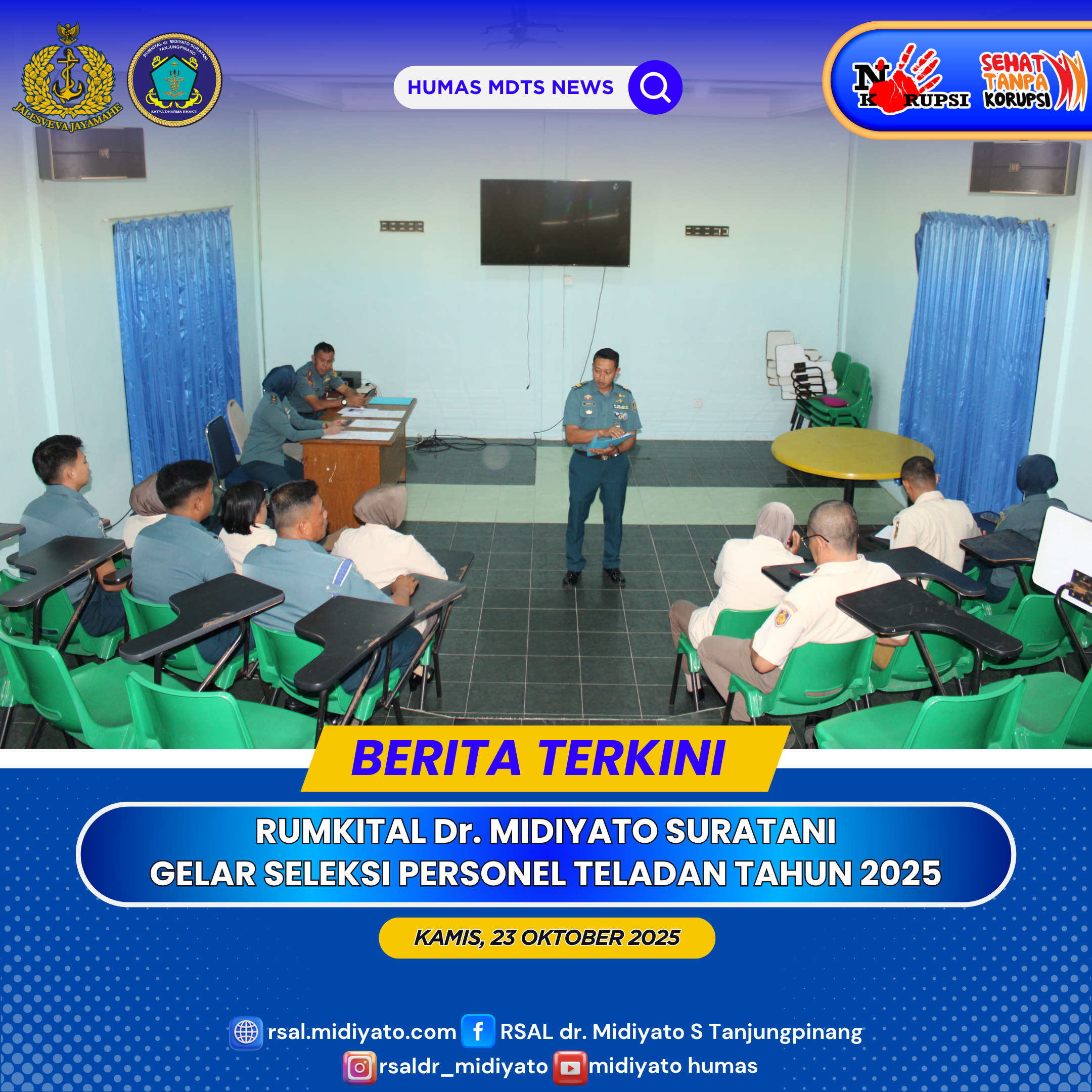 TNI Angkatan Laut. Rumah Sakit Angkatan Laut (Rumkital) Dr. Midiyato Suratani melaksanakan kegiatan seleksi personel teladan tahun 2025, yang diikuti oleh personel non medis dan tenaga kesehatan (nakes) lain. Kegiatan ini berlangsung di Kelas Bangdiklat Rumkital Dr. Midiyato Suratani, Tanjungpinang, Provinsi Kepri. Kamis (23/10/2025) Seleksi ini dilaksanakan sebagai bentuk apresiasi dan motivasi bagi seluruh personel […]