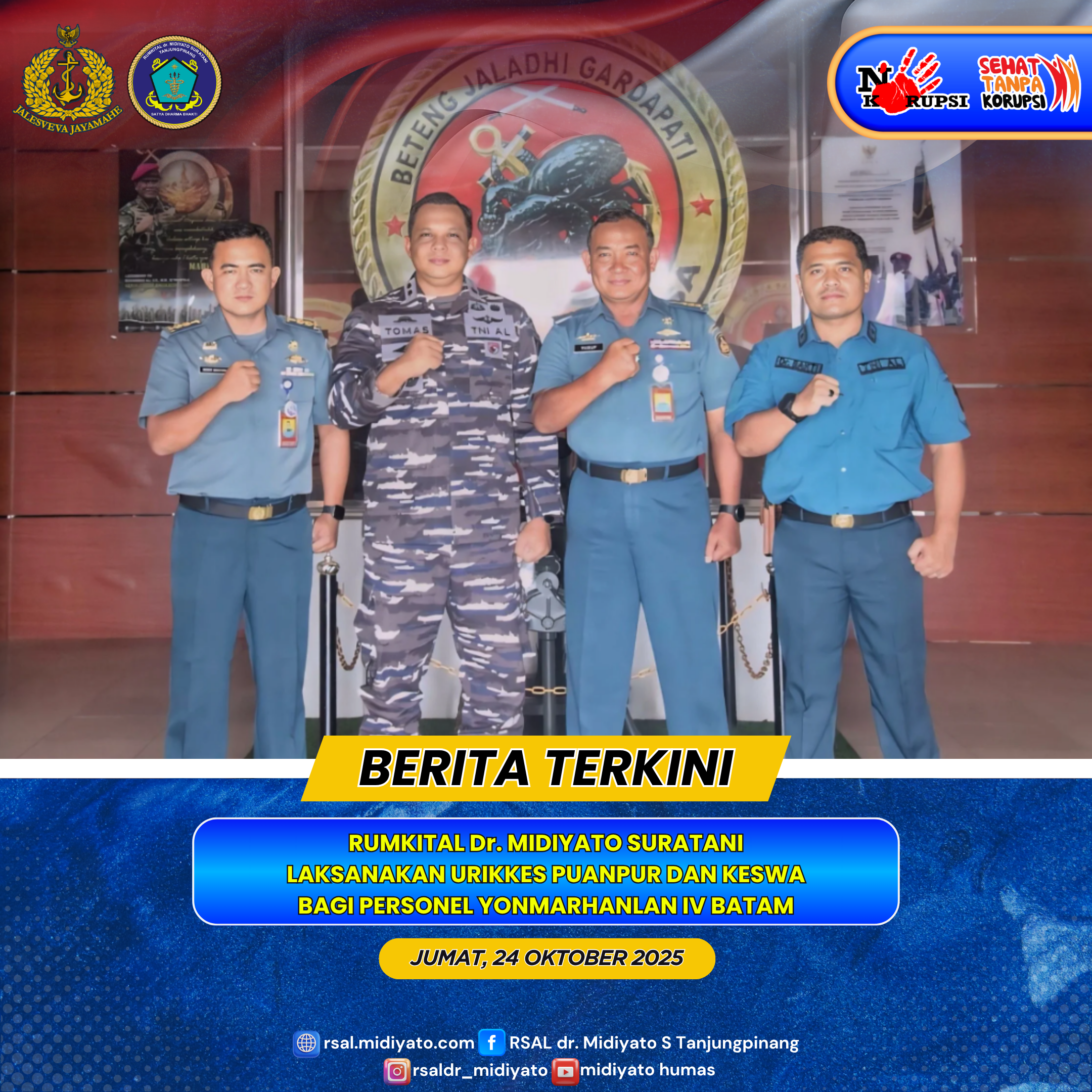 TNI Angkatan Laut. Rumah Sakit Angkatan Laut (Rumkital) Dr. Midiyato Suratani melaksanakan kegiatan Uji Pemeriksaan Kesehatan (Urikkes) Kemampuan Tempur (Puanpur) dan Kesehatan Jiwa (Keswa) bagi personel Yonmarhanlan IV Batam, bertempat di Aula Nakula Yonmarhanlan IV, Batam, Provinsi Kepri. Jumat (24/10/2025) Kegiatan Urikkes ini dilaksanakan selama dua hari, mulai tanggal 23 hingga 24 Oktober 2025, dengan […]